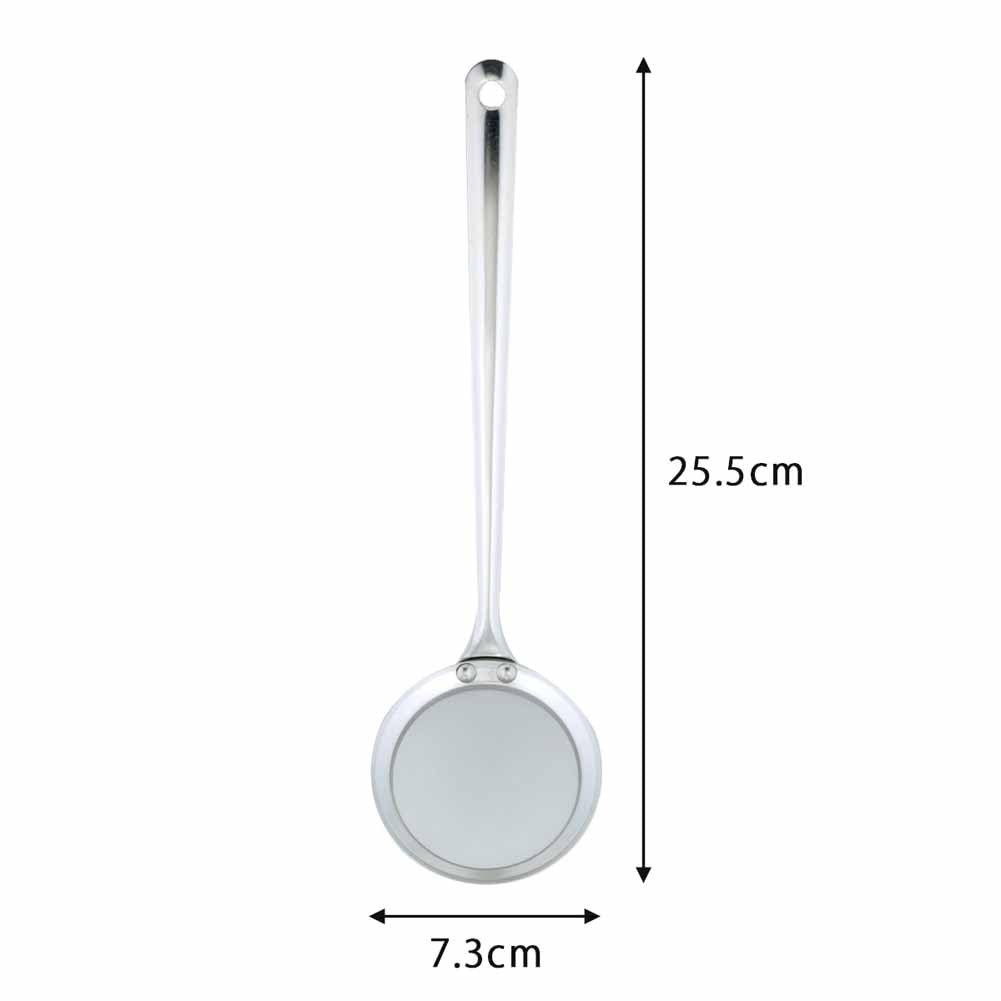 あく取りはこれが一番!シンプル形状で使いやすく、お手入れカンタン。持手も18cmと長くしてありますので、手が熱くなりにくいです。 品番 27538 材質 18-8ステンレス(アミ:60メッシュ) サイズ 幅7.3×全長25.5cm 重量 39g 生産国 日本 JANコード 4957423039741