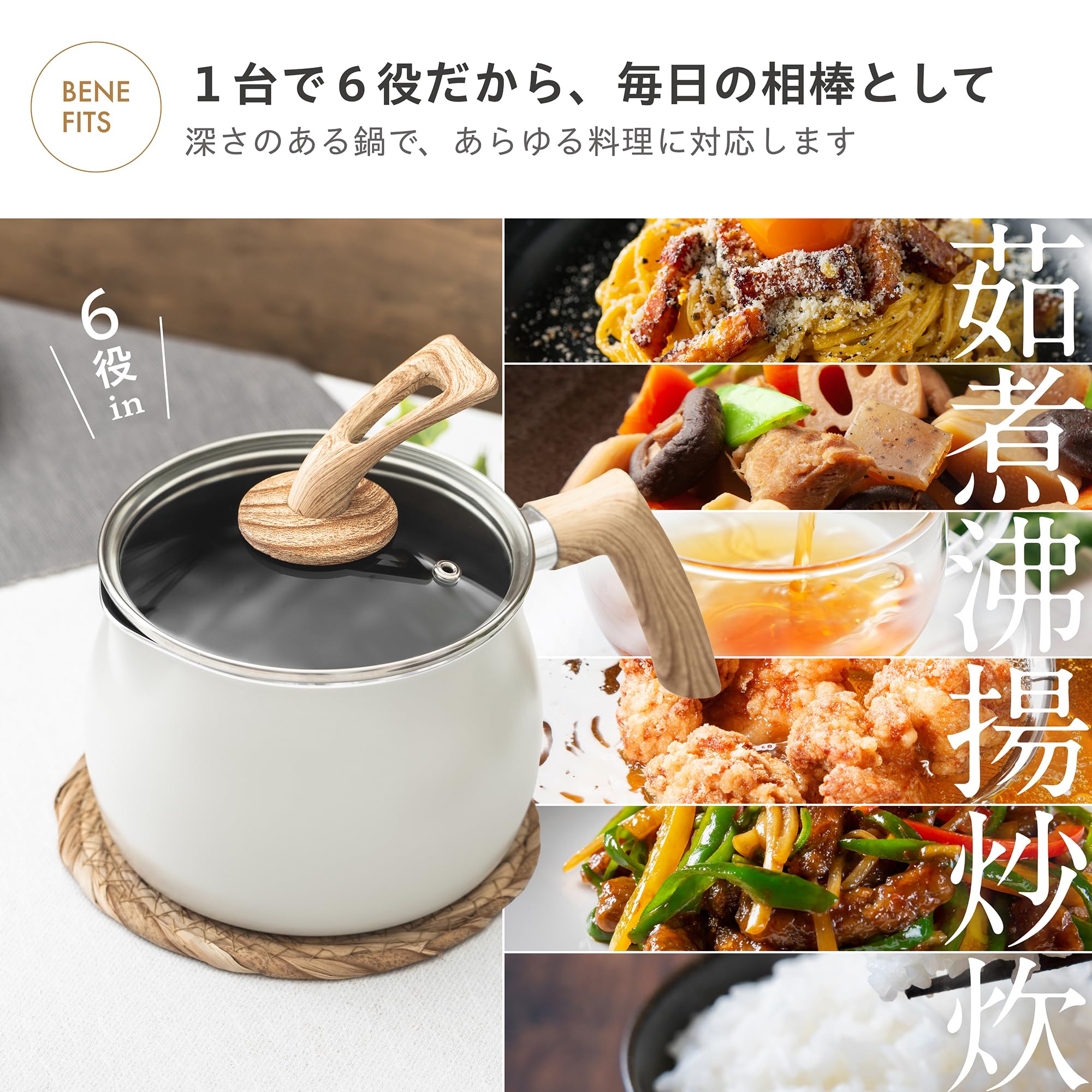 これ1つで、茹でる、沸かす、炒める、煮る、揚げる、炊くの6役をこなします。