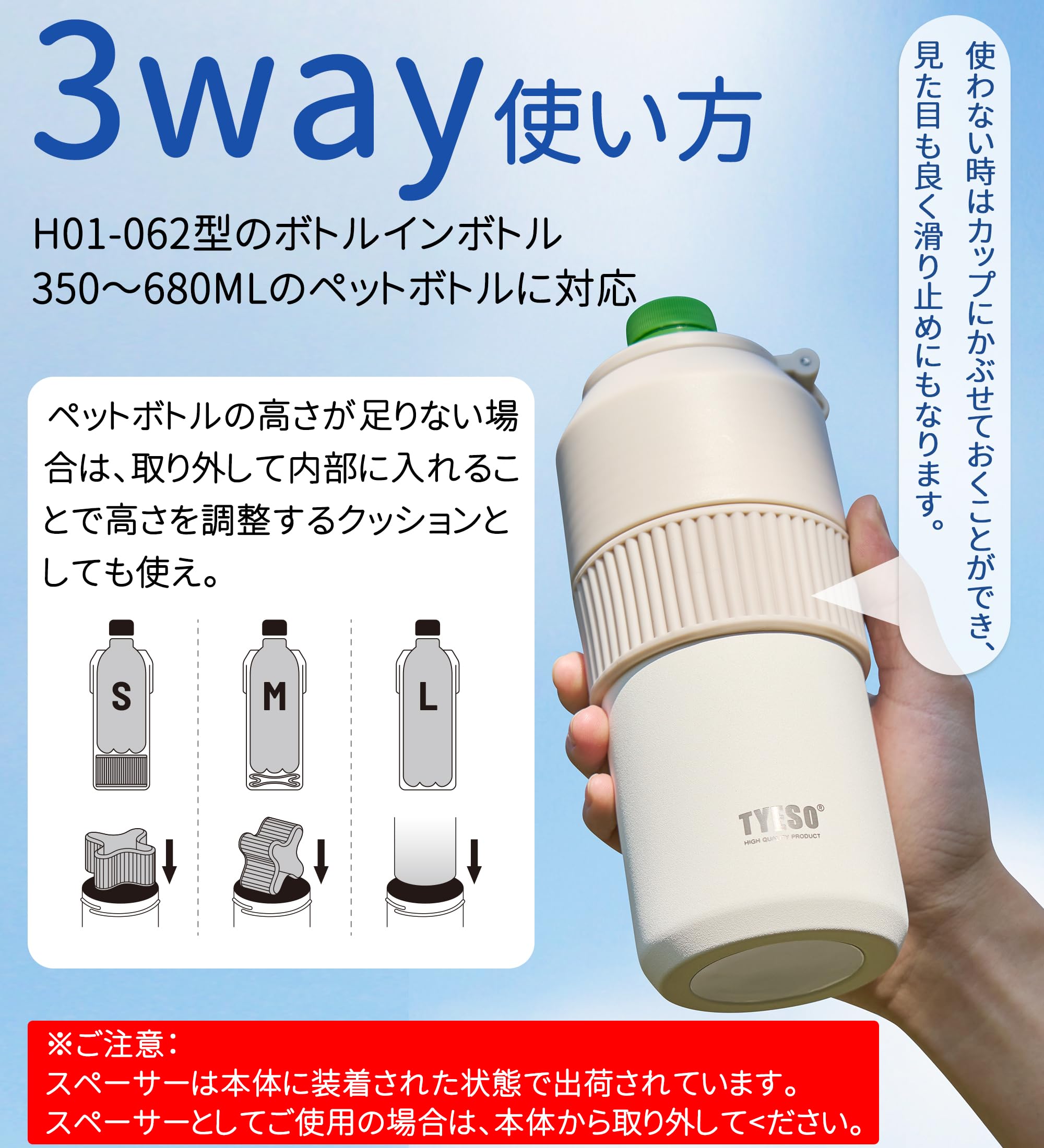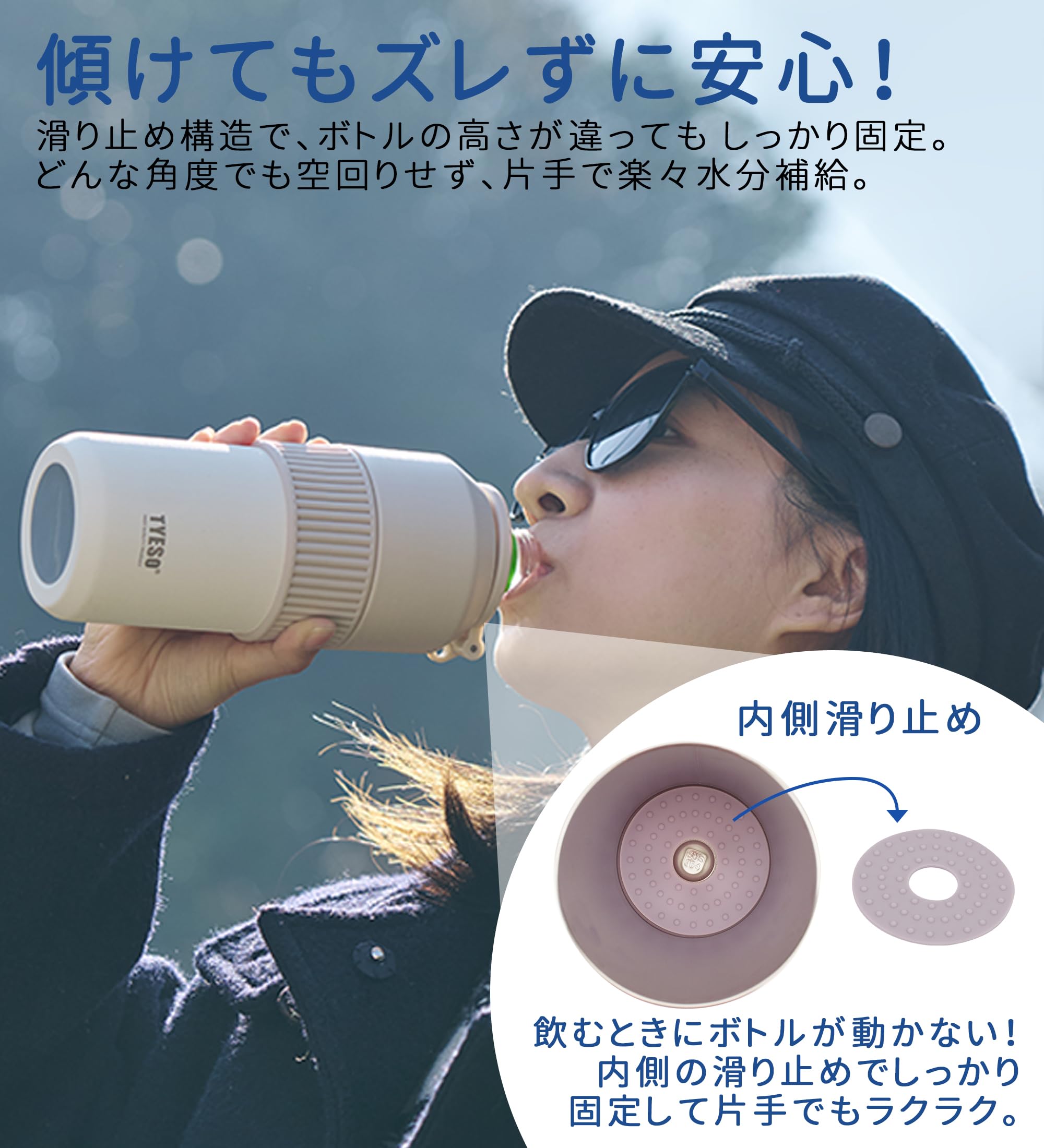 マルチ対応設計:スペーサー付きで350ml〜680mlの様々なペットボトルにフィット。本体サイズは高さ17.6cm、胴径7.6cm、飲み口3.8cm、重さは約266.7g。市販の多くのペットボトルに対応する保冷ボトルです。底面には滑り止めパッドを備え、安定して置けます。さらに付属のシリコン製スペーサーは、サイズ調整だけでなく、外側に装着すれば滑り止めパーツとしても使用可能。用途に応じて活用できる実用設計です。