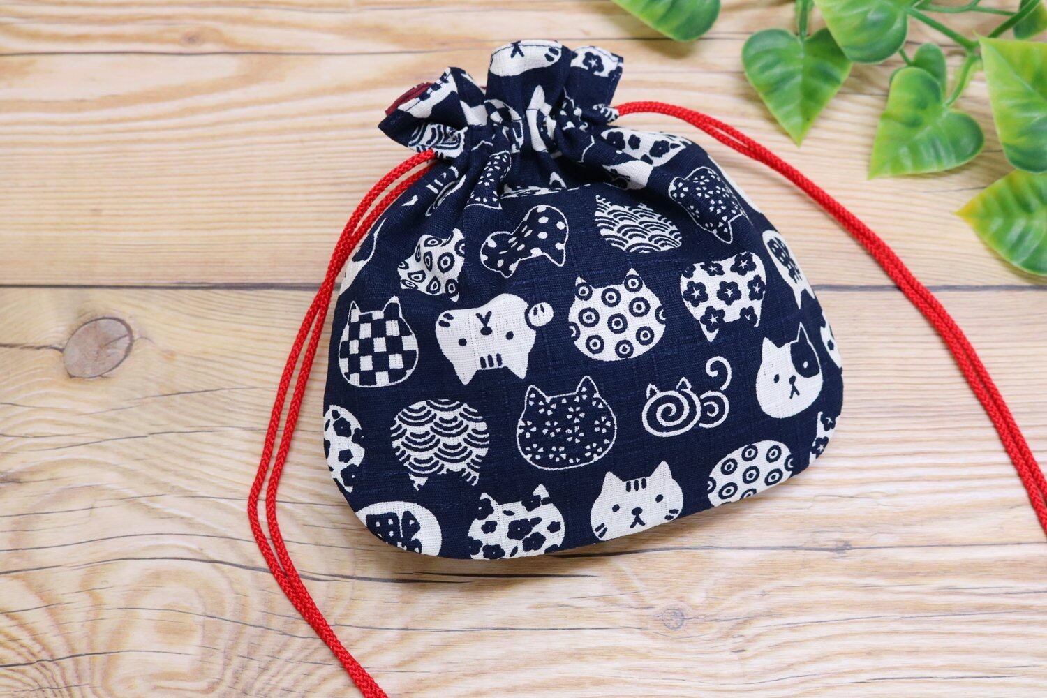 京佑(Kyoyu) 巾着 袋 小物入れ アクセサリー ミニ 猫 和柄 綿 日本製 にゃんこもん 紺 16.5×17cm