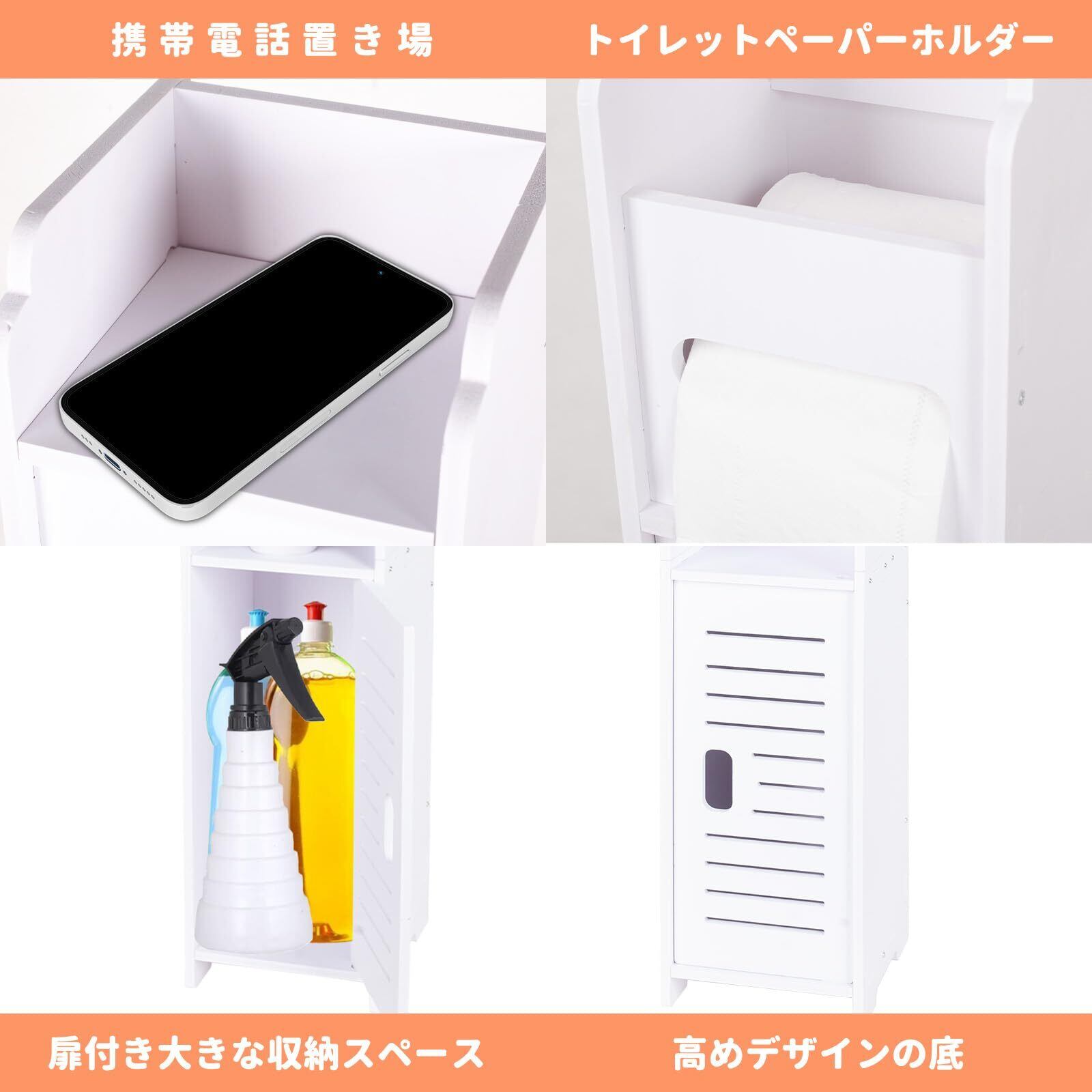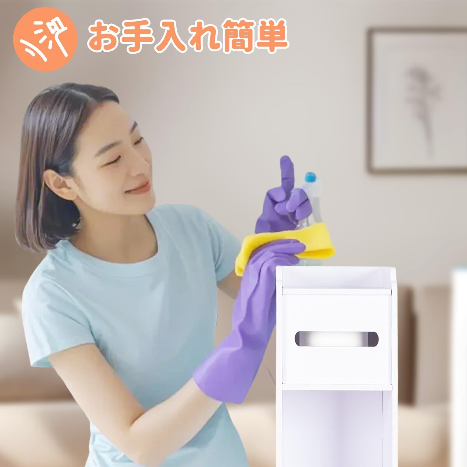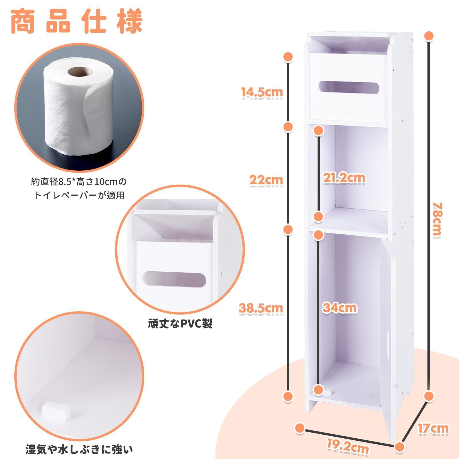【狭いトイレでも置けるサイズ】サイズは約幅17*奥行19*高さ78cmで、狭いトイレでも置ける、商品サイズは幅わずか19cmのスリム設計縦型のスリムな設計で邪魔にならないサイズ感、省スペースに収納空間を作るため、徹底的にスリムなデザインにこだわりました。清潔感のある白さがあり、スリムでシンプルなデザインなので、お部屋のどこに置いても馴染みます。