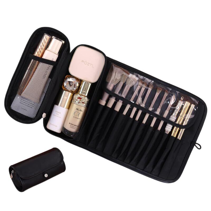 化粧ポーチ メイクブラシケース 2in1 巻き携帯 12本収納 左右仕切り 省スペース 撥水PU素材 3色展開 メイクポーチ メイクブラシ収納 コスメポーチ 旅行/自宅/業務用 携帯用 (ブラック)