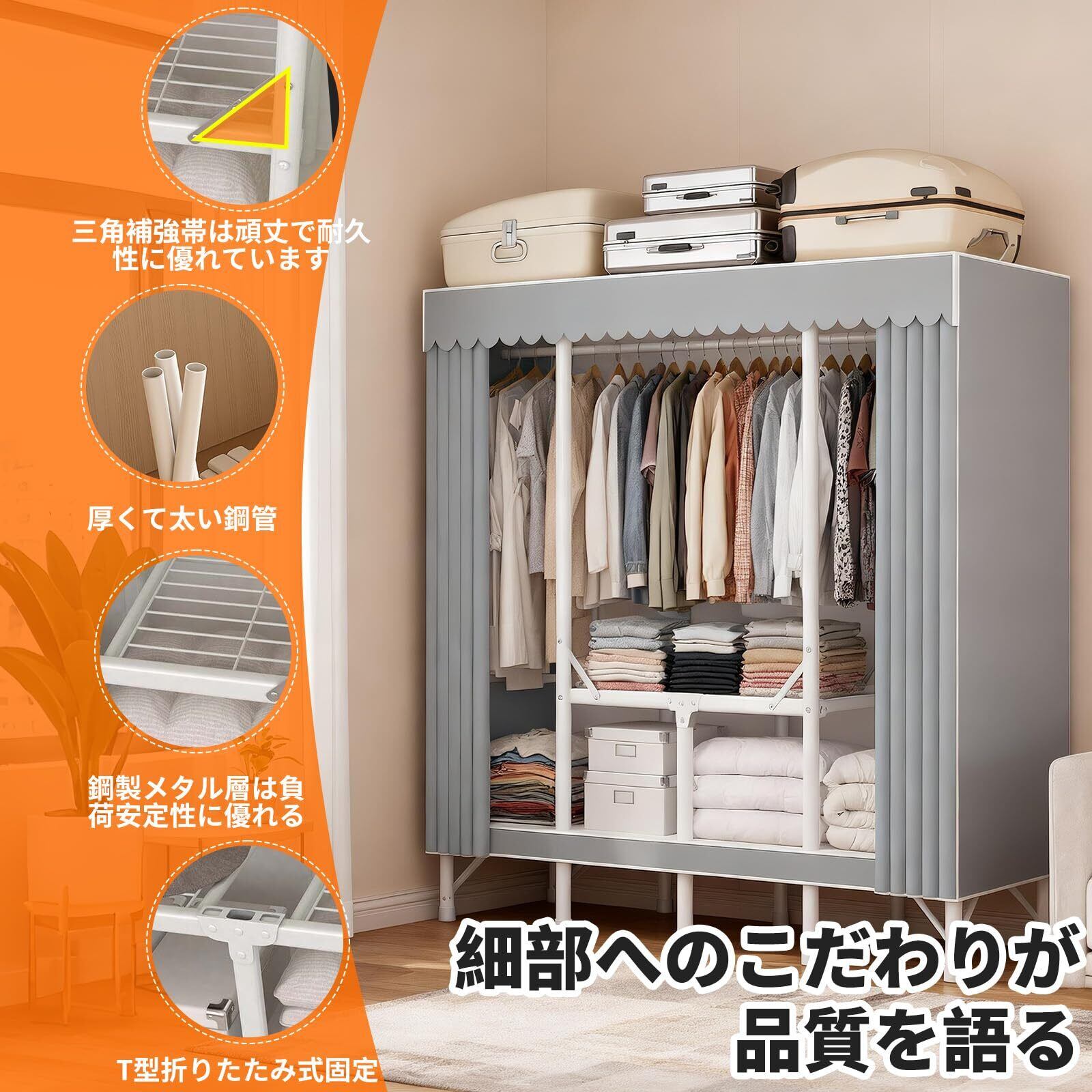 約幅210×奥行48×高さ172cmの大容量ワードローブで、シングルからカップルまで快適に利用できます。頑丈な金属フレームに防塵性に優れたカバーを採用し、ホコリが付着しにくく清潔を保ちます。