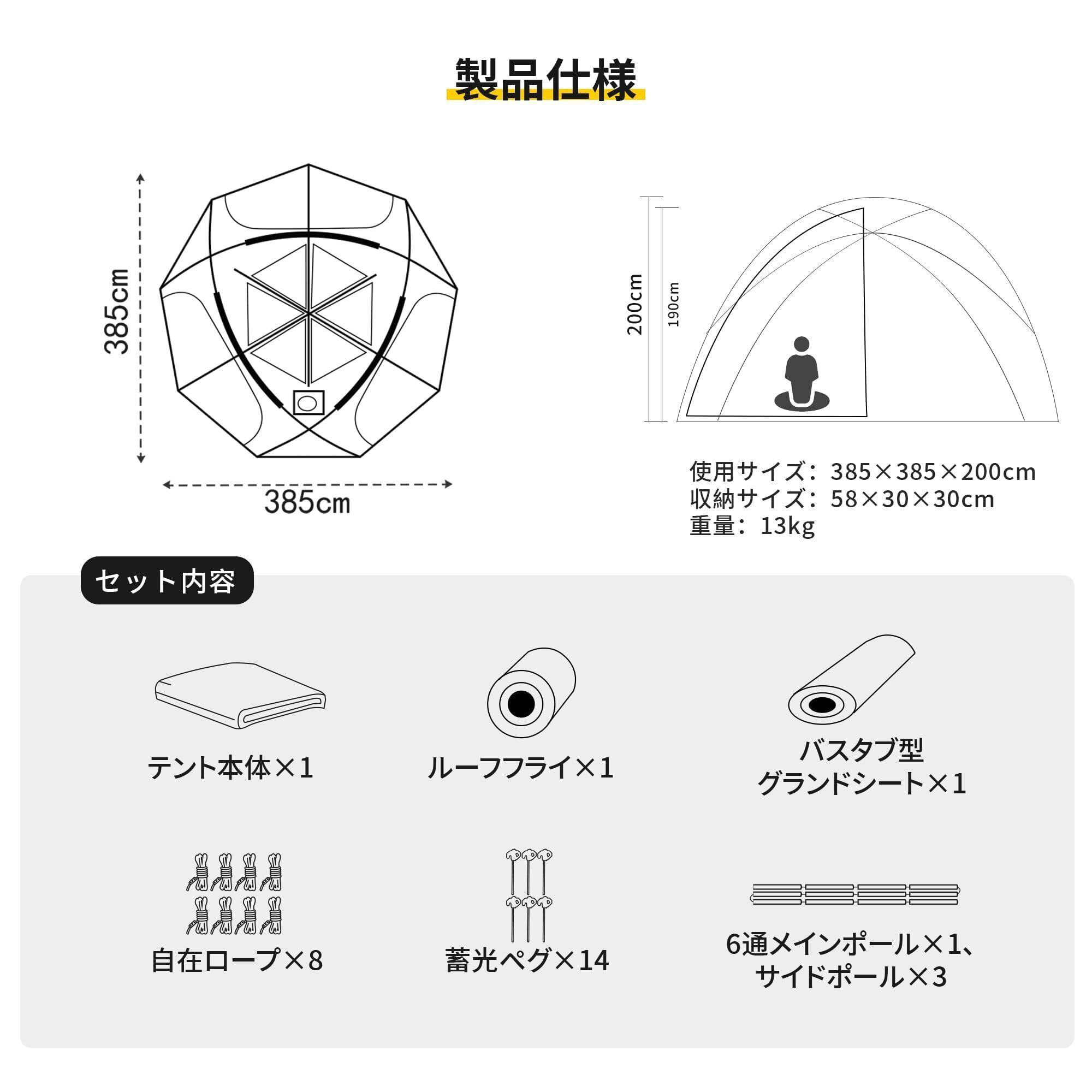 【広々とした大空間 & 優れた通気性】直径約3.85m × 高さ2mの解放的なビッグサイズ。テント内での直立が可能で、中央にポールがないため家具の配置も自由自在。最大4〜6人まで余裕を持って過ごせます。さらに6カ所の2層ドアを備え、「フルオープン⇔フルメッシュ」の切替で360°換気&視界を確保し、蒸れにくく快適な環境を維持します。