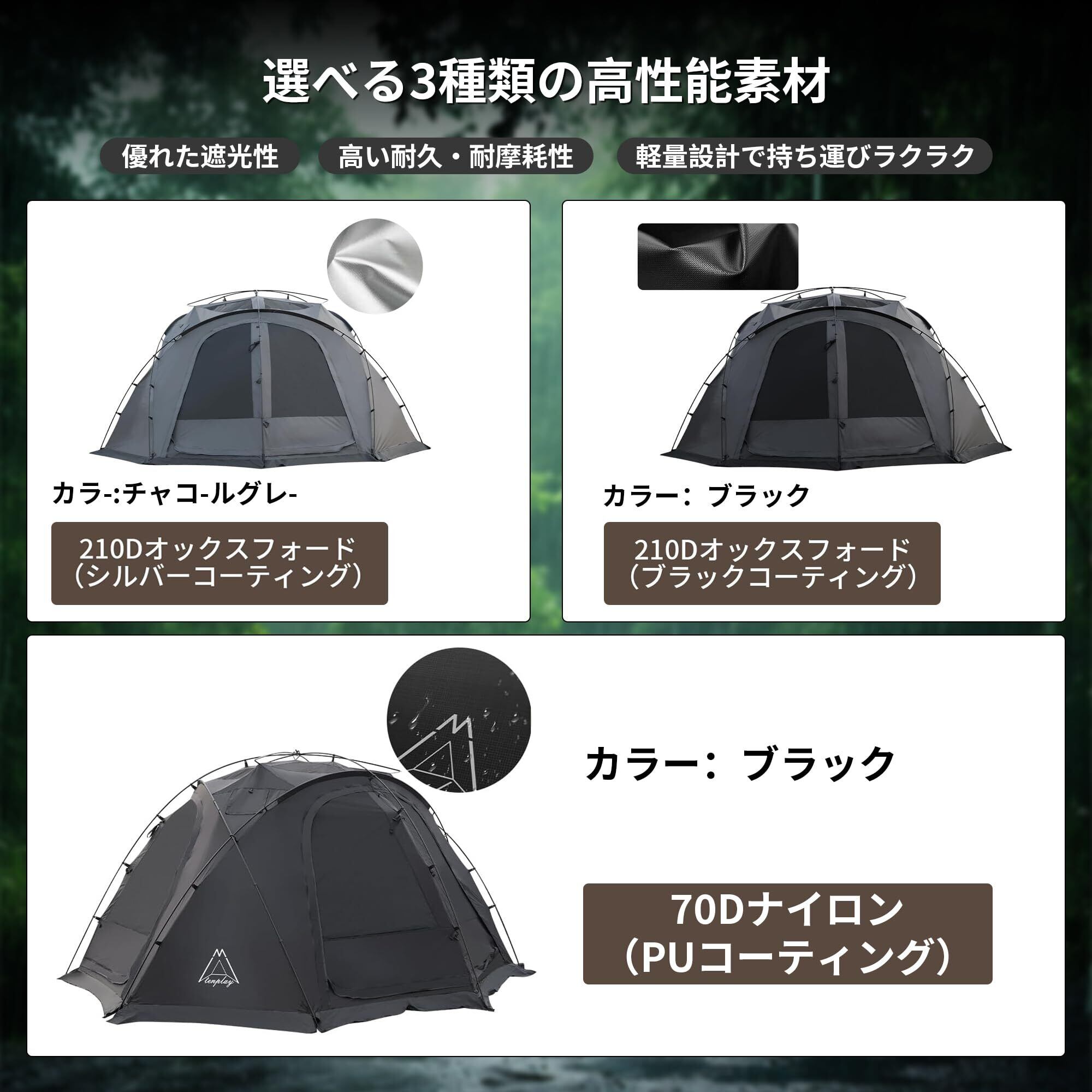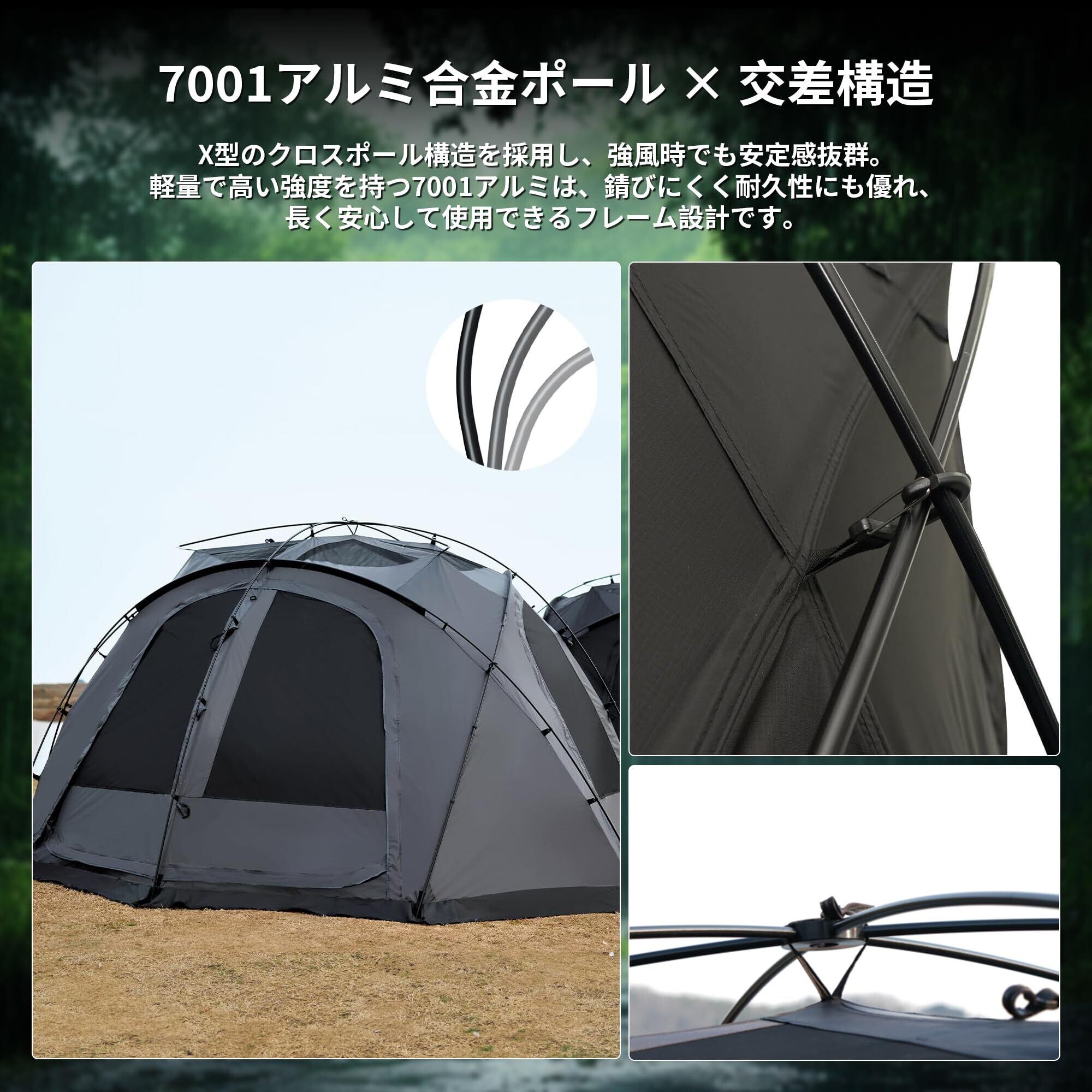 【高強度な材質】 テント生地は強く耐久性の高い210Dオックスフォードを採用し、シルバーコーティングを施しており、遮光性が高くて、耐水圧は5000mmと雨に強い素材です。風や雨中にも快適にキャンプを楽しめるドームテントです。丈夫な7001アルミ合金ポールを採用し靭性があり、折れにくい。