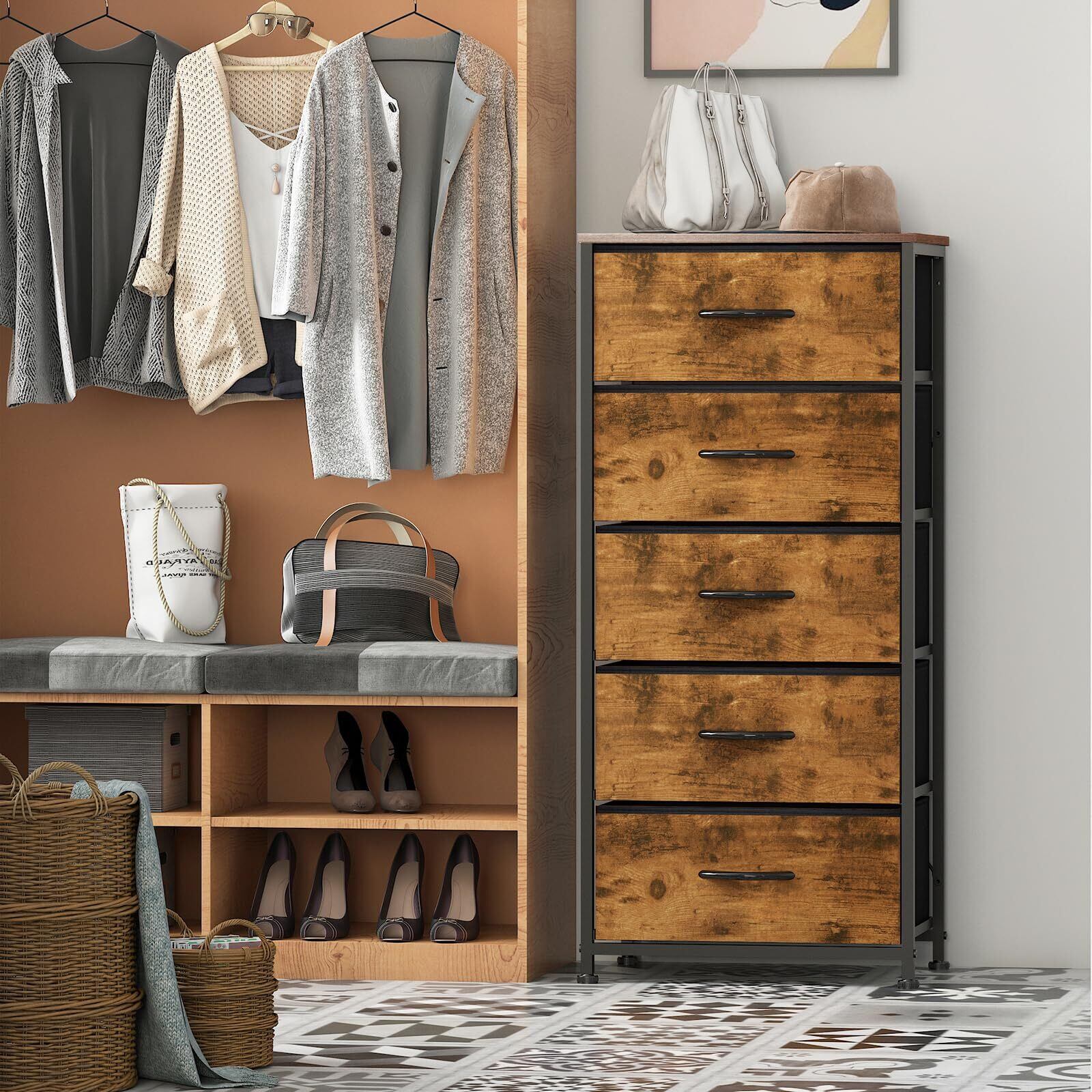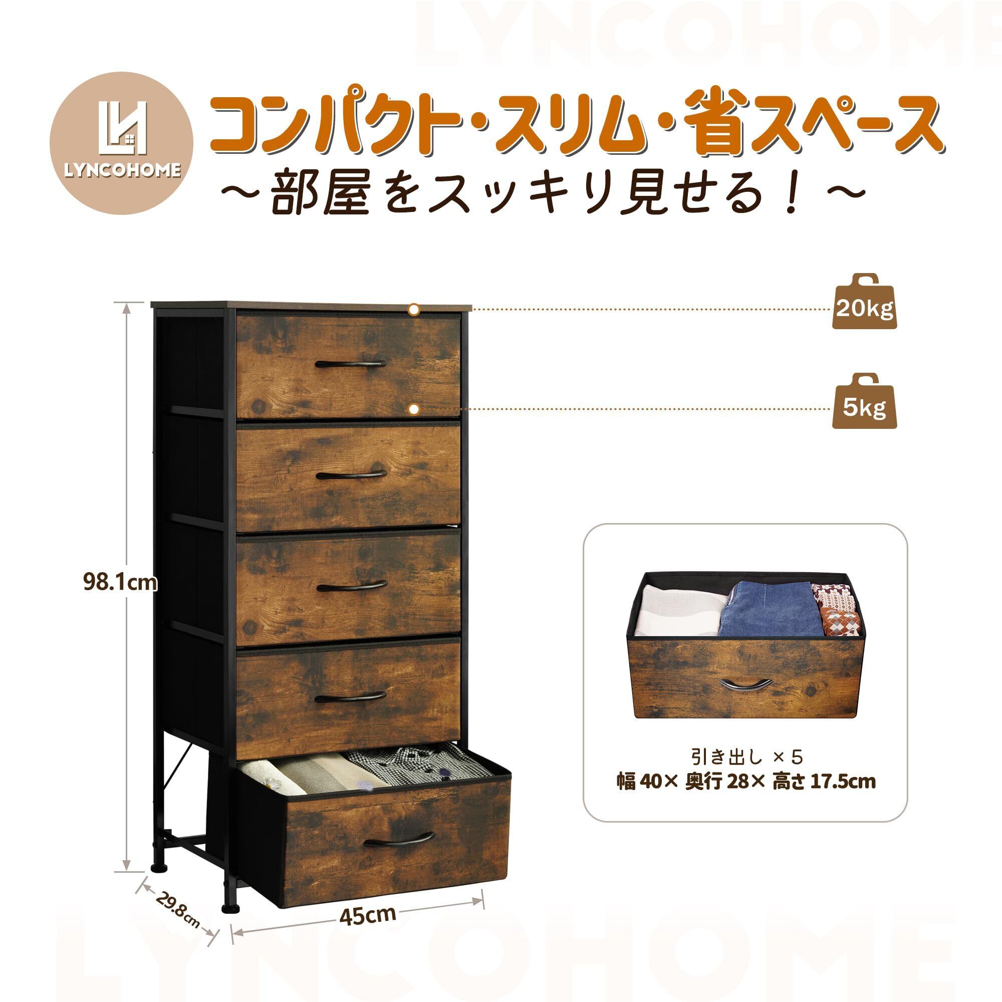 LYNCOHOME チェスト タンス 隙間収納 ヴィンテージ風 北欧風 スリムストッカー 布製 引き出し シンプル 一人暮らし 転倒防止 一体型フレーム設計 5段