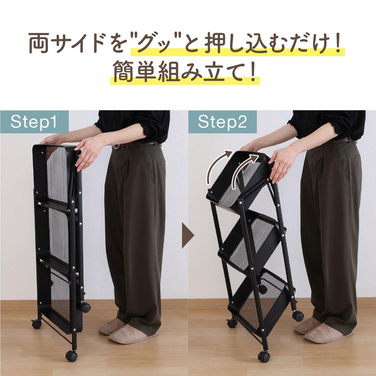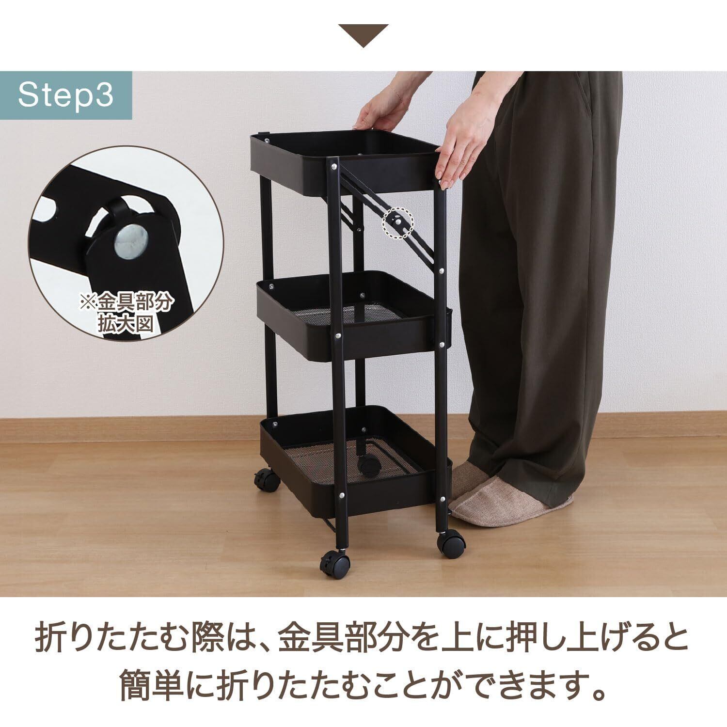 組み立てはキャスターをつけるだけ!たためるマルチワゴン3段
