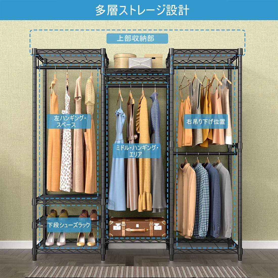 多機能:このハンガーラックは5段収納棚付きで、おしゃれなデザインが特徴です。洋服ハンガーとしても使え、衣類、アクセサリー、寝具、シューズなどを整理整頓できます。4本の衣類収納用ロッドはそれぞれ60ポンドまでの重さを支えることができ、スーツ、コート、ドレス、ジャケットなどの重い服をかけるのに最適です。