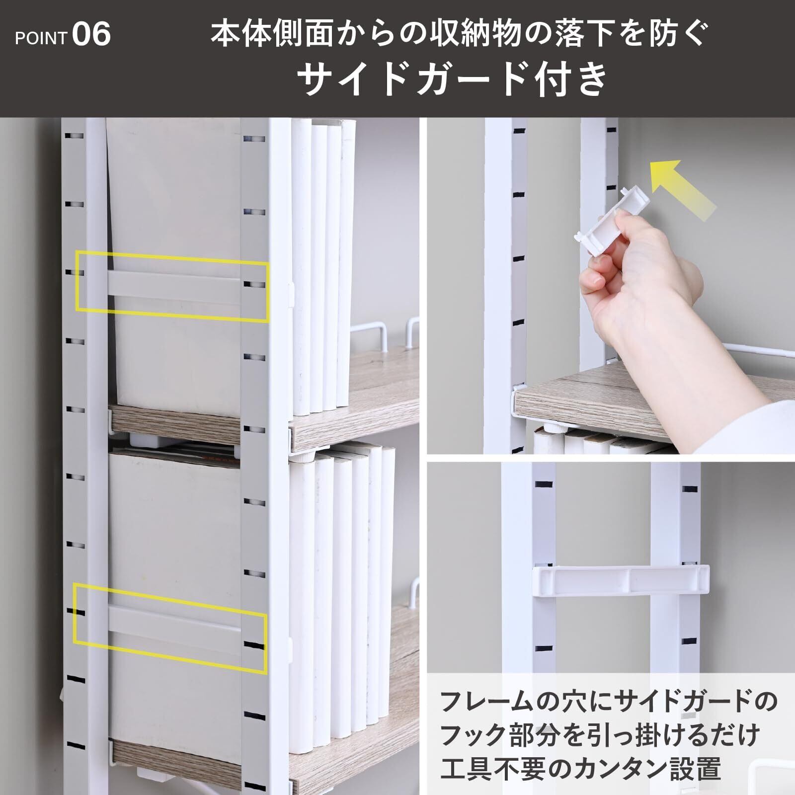 【棚板高さ調節がカンタン】棚板は4cm間隔で高さを変えられます。付属の棚板受けをスリットに引っ掛けて高さ調節でき、棚板の固定用ボルトは手で付け外しできるのでカンタンに変えられます。