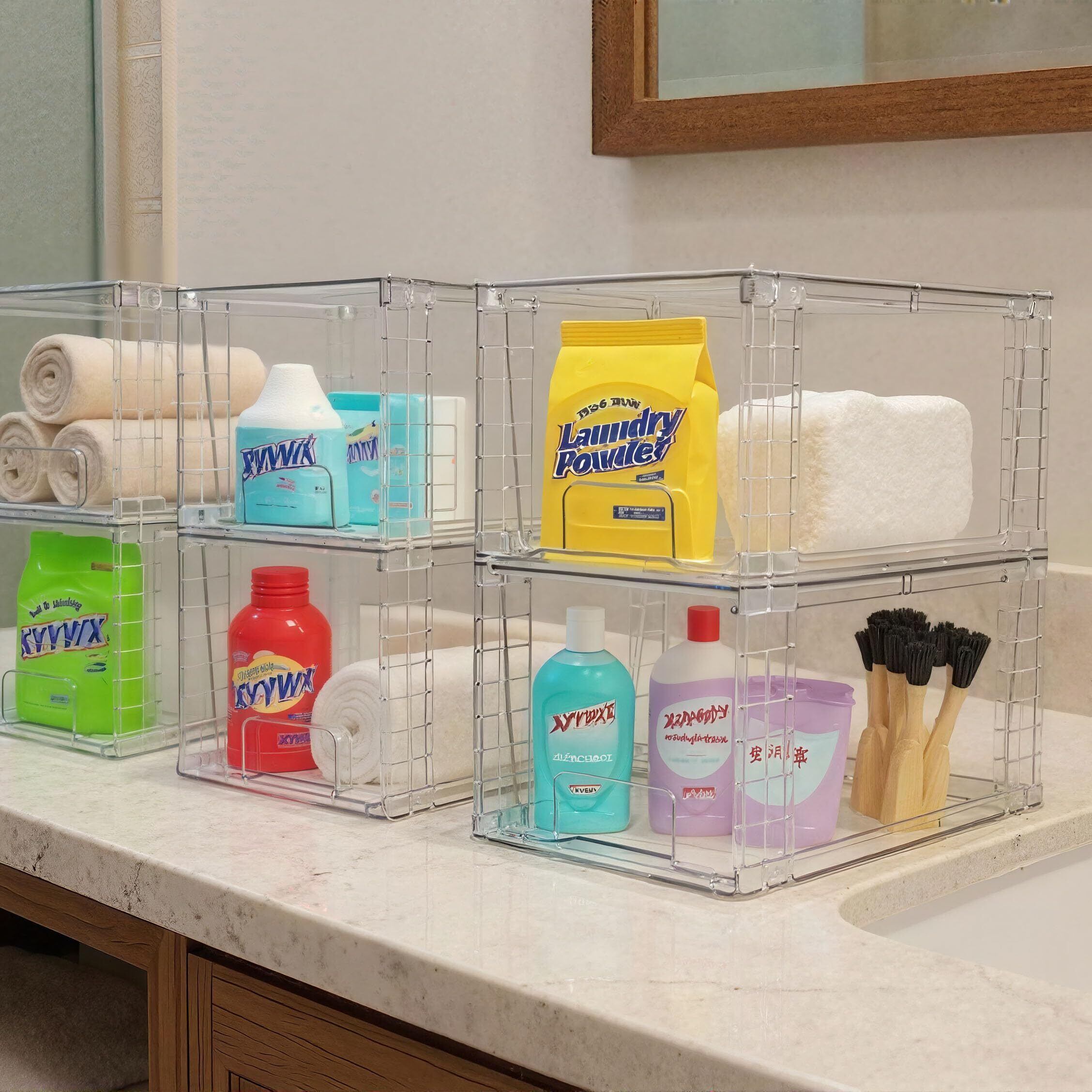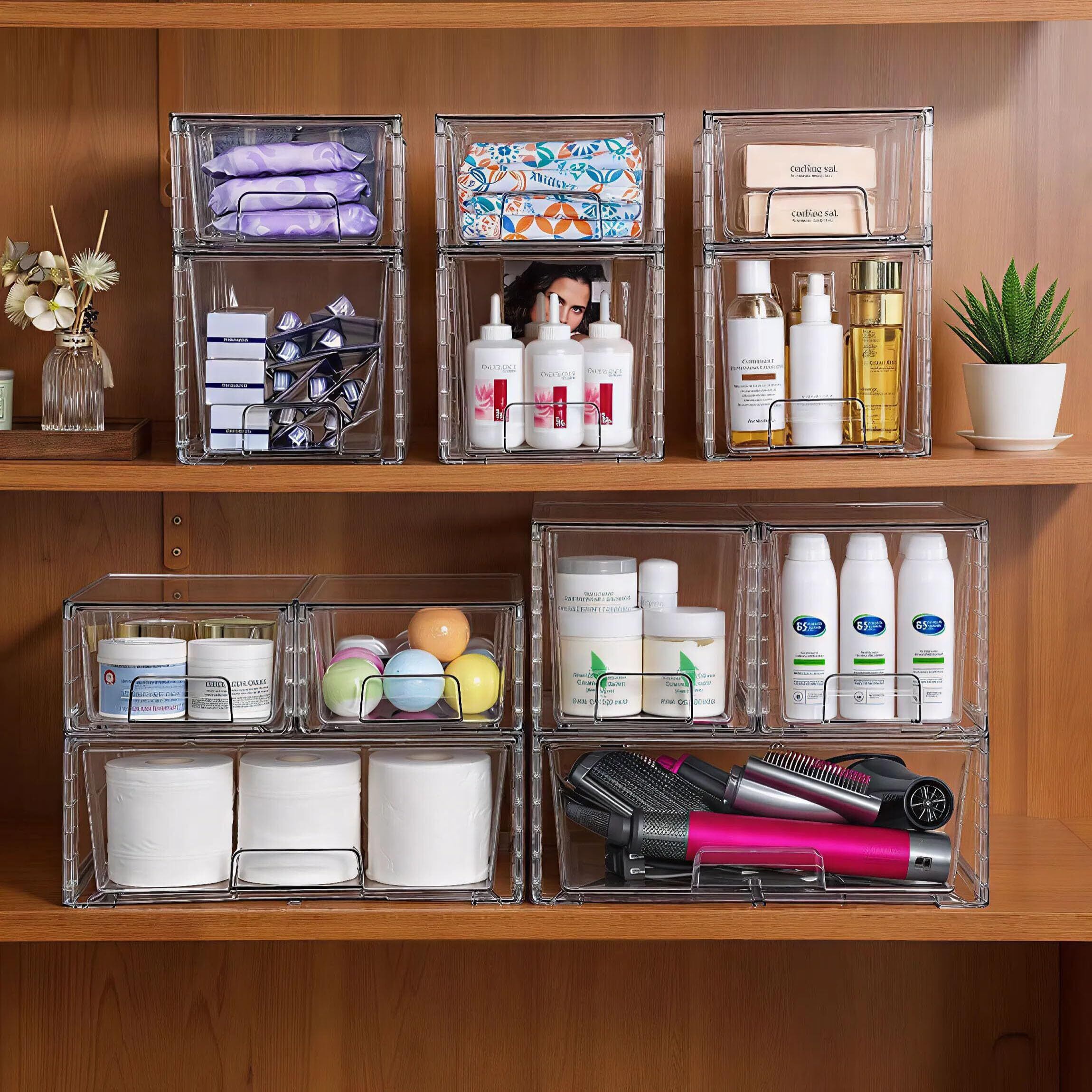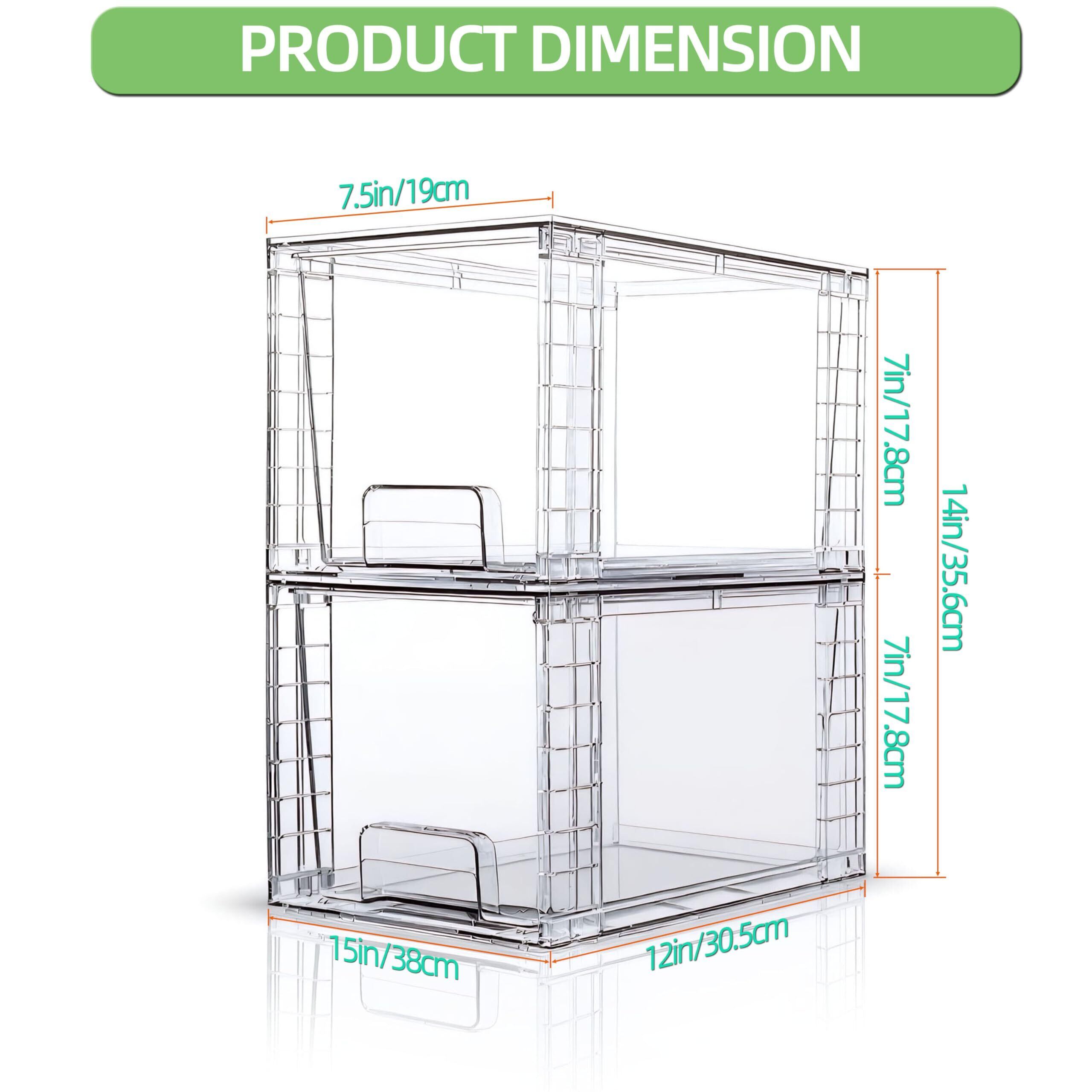 2個セット 中号 積み重ね可能クリア収納引き出し ハンドル付き アクリル製 バスルーム キッチン シンク下 キャビネット クローゼット メイク パントリー整理