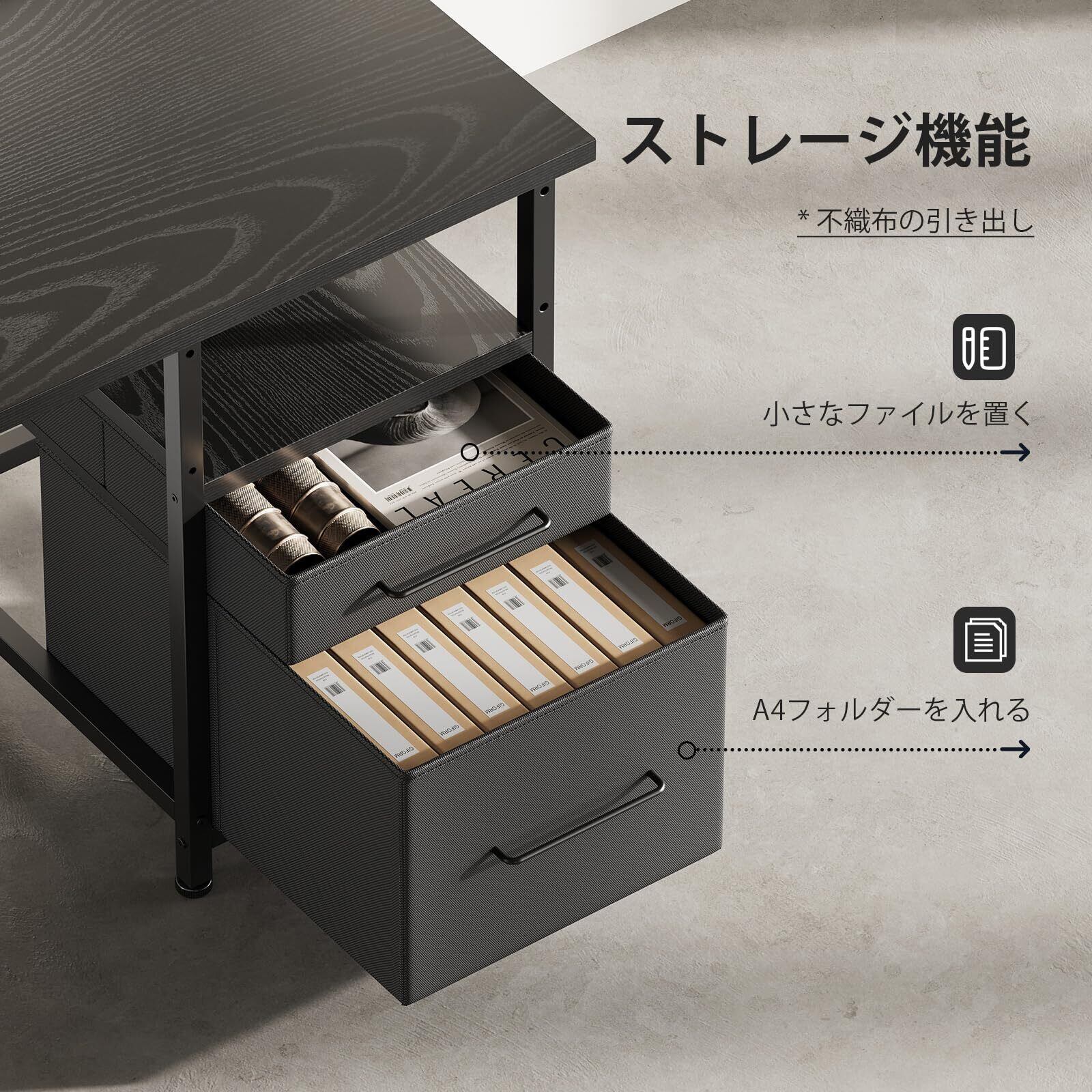 【収納力大活躍】 机の下の段の板と2つの異なるサイズの引き出しが付いています。ラミネートボードには、日常的に使うものが入っています。引き出しには、書類や大きなフォルダーが入っていたり、机の上のモノが散らかっていたりします。収納力満点です。