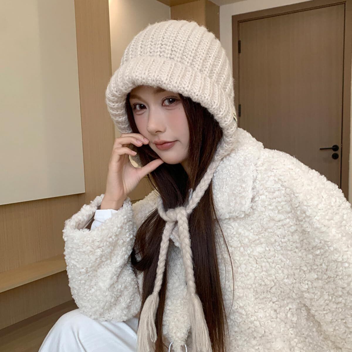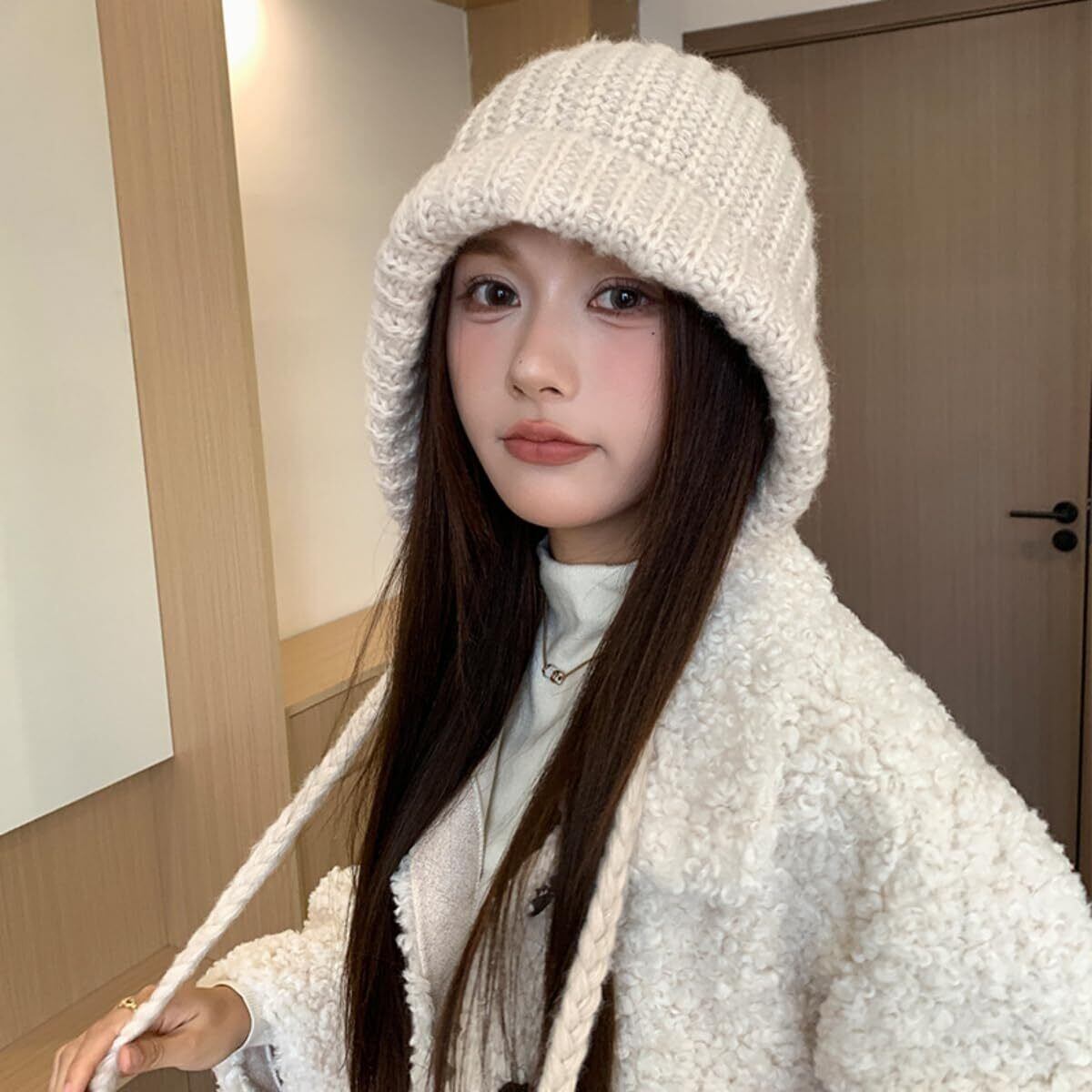 【かわいさ引き立つデザイン】長いイヤーストラップでデザインされたこのハットは、顎でリボンを結べば、甘くてキュート。 三つ編みのコードがニット帽全体のデザインを引き立て、紐先で揺れるポンポンがさらに可愛さをアップさせます。ダブルポニーテールやツイスト編みで、スマートで遊び心のあるスタイルに