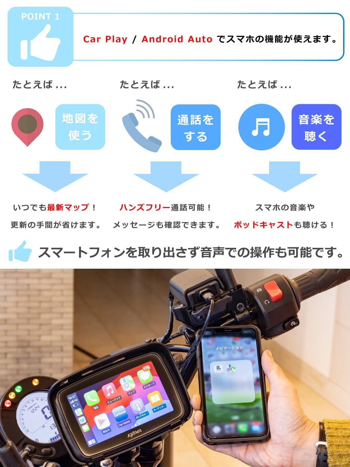 簡単操作のモーターサイクル用ディスプレイオーディオ 【スマートディスプレイ SD01】です。