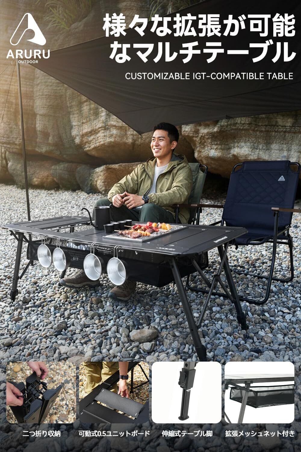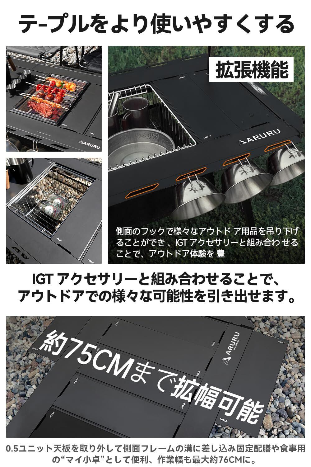 【ARURU独自構造|5ユニットIGTテーブル】137cm×58cmのワイドサイズで、最大5ユニットを搭載できる拡張型IGTテーブル。付属の10枚(0.5U×10)の天板は自由に取り外し可能で、中央部にグリル、ドリップバスケット、シンクなどをビルトインできます。シーンに合わせて自由にカスタマイズでき、理想のアウトドアキッチンを構築。