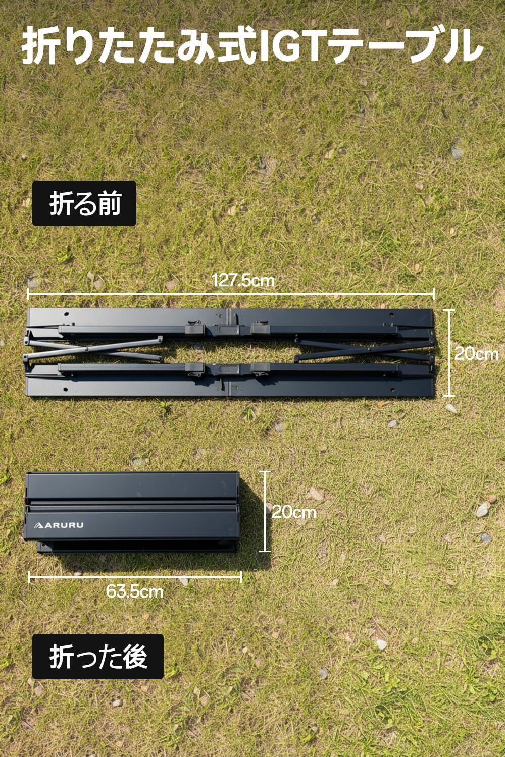 【対折フレーム構造|収納体積50%削減】ARURU独自の「中央折りたたみ構造」を採用。テーブルを半分に折ることができ、収納サイズはわずか63.5×20cm。さらにすべてのアクセサリーを専用キャリーバッグに入れても72×27cmとコンパクト。車載・保管が簡単で、持ち運びもラクラクです。