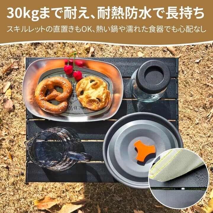「耐熱・防水仕様|多様なアウトドアシーンに対応」アルミニウム合金ならではの高い耐熱性で、バーベキューの熱い鍋やケトルも直接置けます。さらに防水性も確保しており、雨天時のキャンプでも安心。季節を問わず様々なシーンで活躍する万能テーブルです。