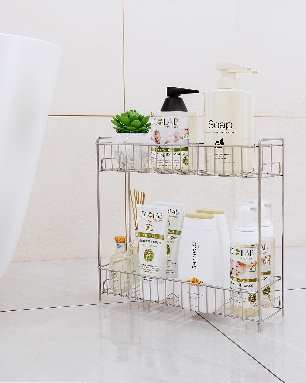 2段構造設計: 効率的な収納スペースを提供し、バスルームアイテムを整然と配置できます