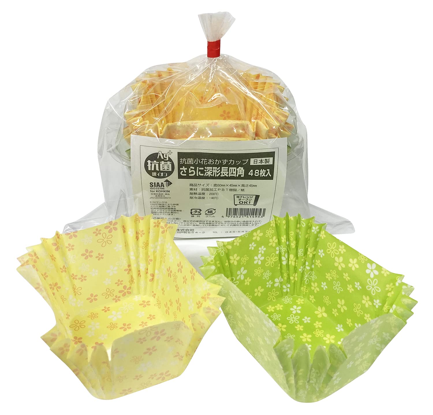 ヒロカ産業 抗菌小花おかずカップ さらに深形長四角 48枚入 袋入り 深さ約45mm 抗菌 オーブンレンジ可 日本製 グリーン、イエロー