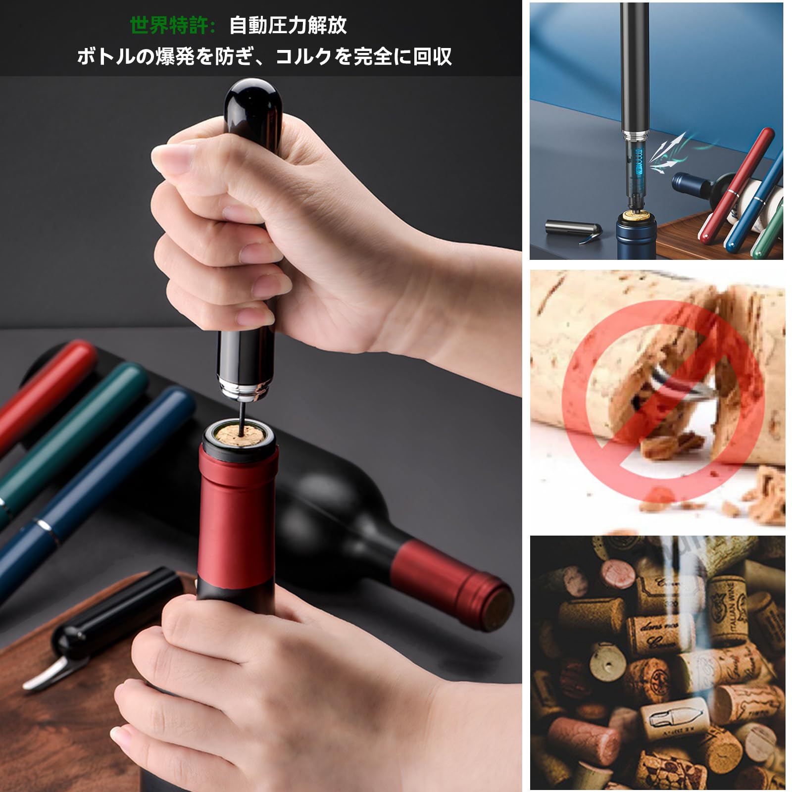 エアーポンプ式ワインオープナー フォイルカッター付き 2in1 空気圧ワインオープナー ワインボトルオープナー 簡単に開けられる 携帯用旅行 ワインコルクスクリュー ハンドヘルド