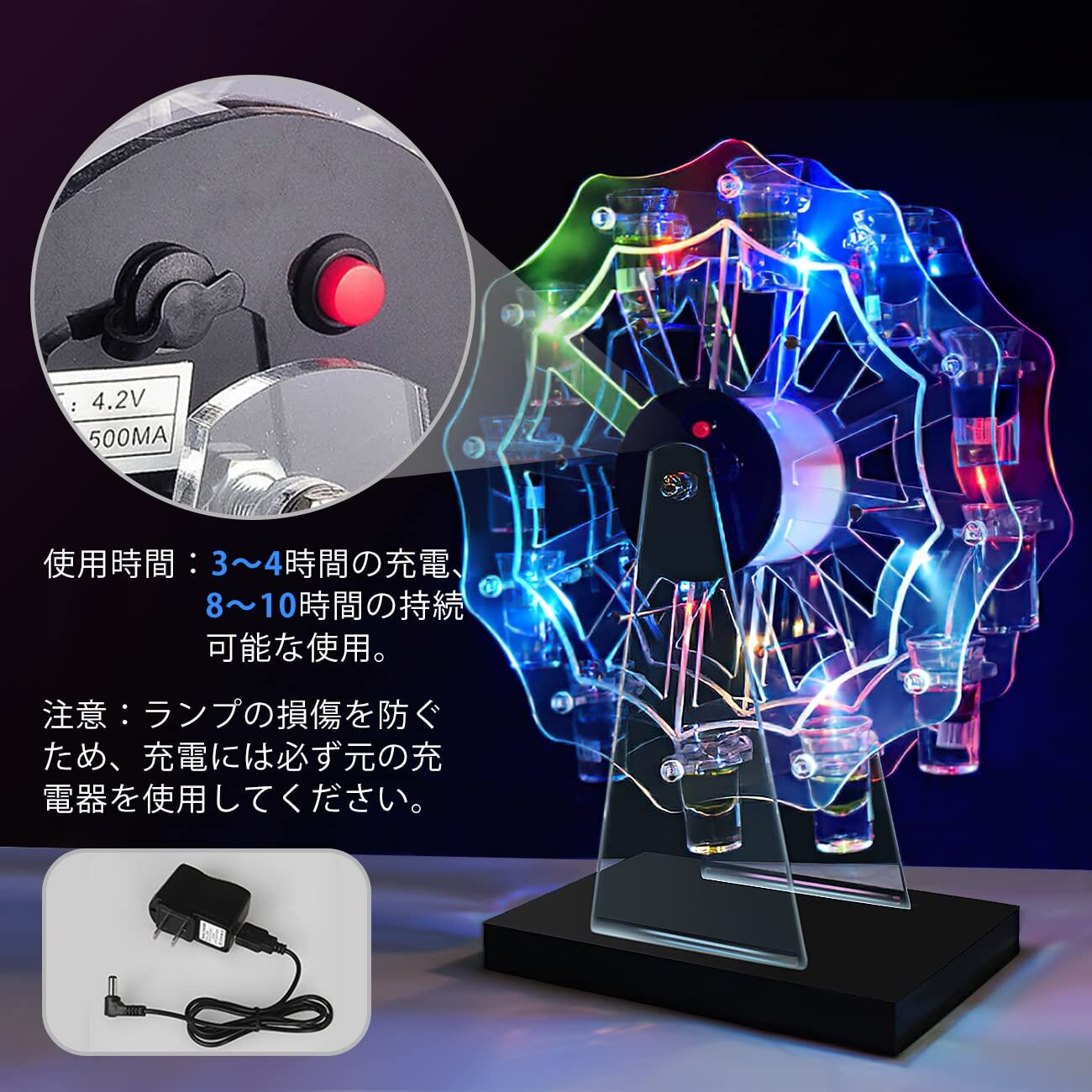 「雰囲気を高める」観覧車のデザインはとても目を引き、7色のLEDライトは自由に変えることができ、観覧車本体も回転させることができます。パーティー、バーなどの場合あるいはその他のイベントに雰囲気を加え、錦上に花を添えてみましょう。【ご注意:ワイングラスは含まれません。】