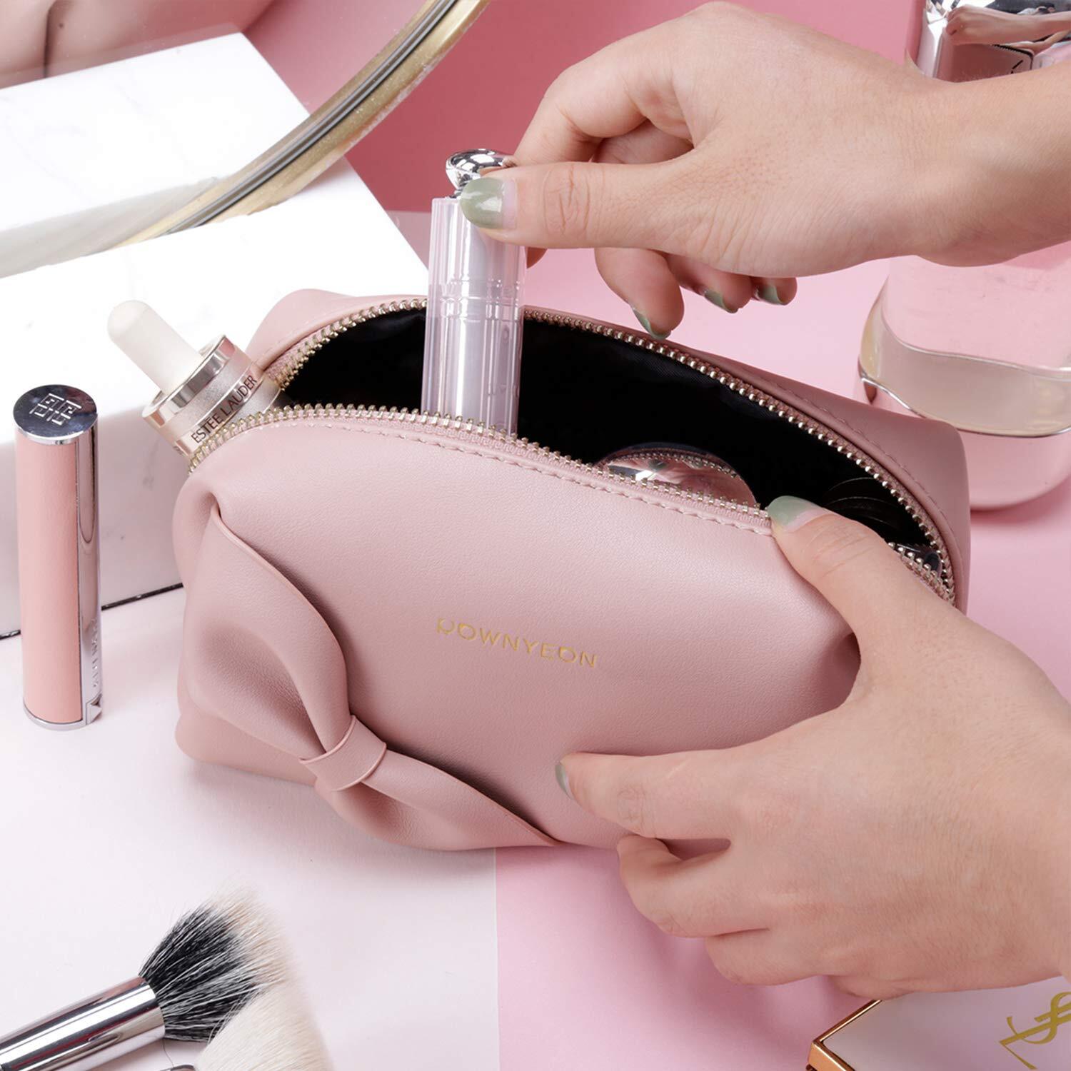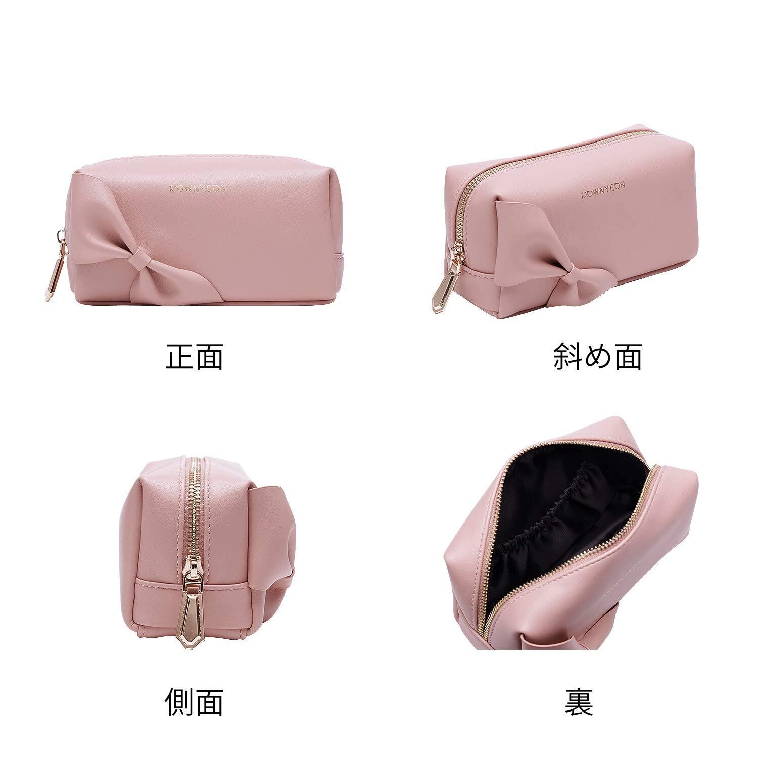 Rownyeon メイクポーチ 持ち運び かわいい コンパクト 仕切りたくさん 化粧ポーチ 韓国風 リボン ペンケース 防撥水 PU 小物入れ ミニ 小さめ ピンク ブラシいれ ペン入れ 誕生日贈り物 ギフト