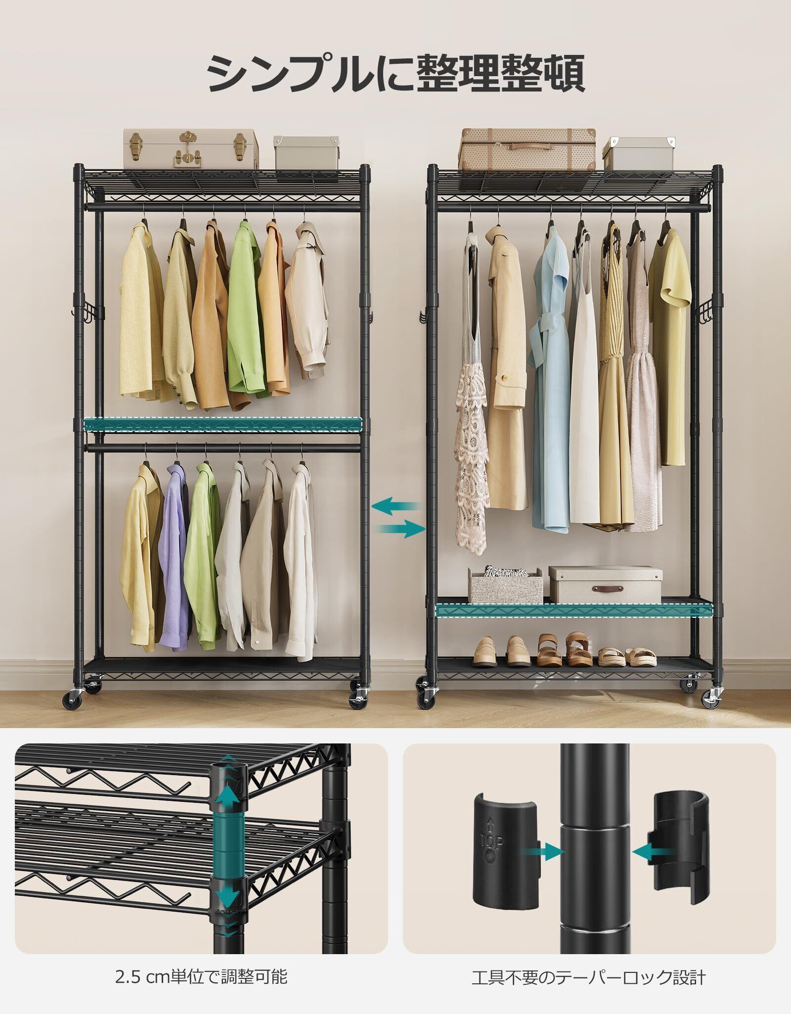 【カスタマイズ収納】棚とハンガーポールは2.54 cm単位で上下に調整可能。ワードローブの収納ニーズに合わせて自由にカスタマイズできるので、洋服や小物をすっきり整理整頓できます!