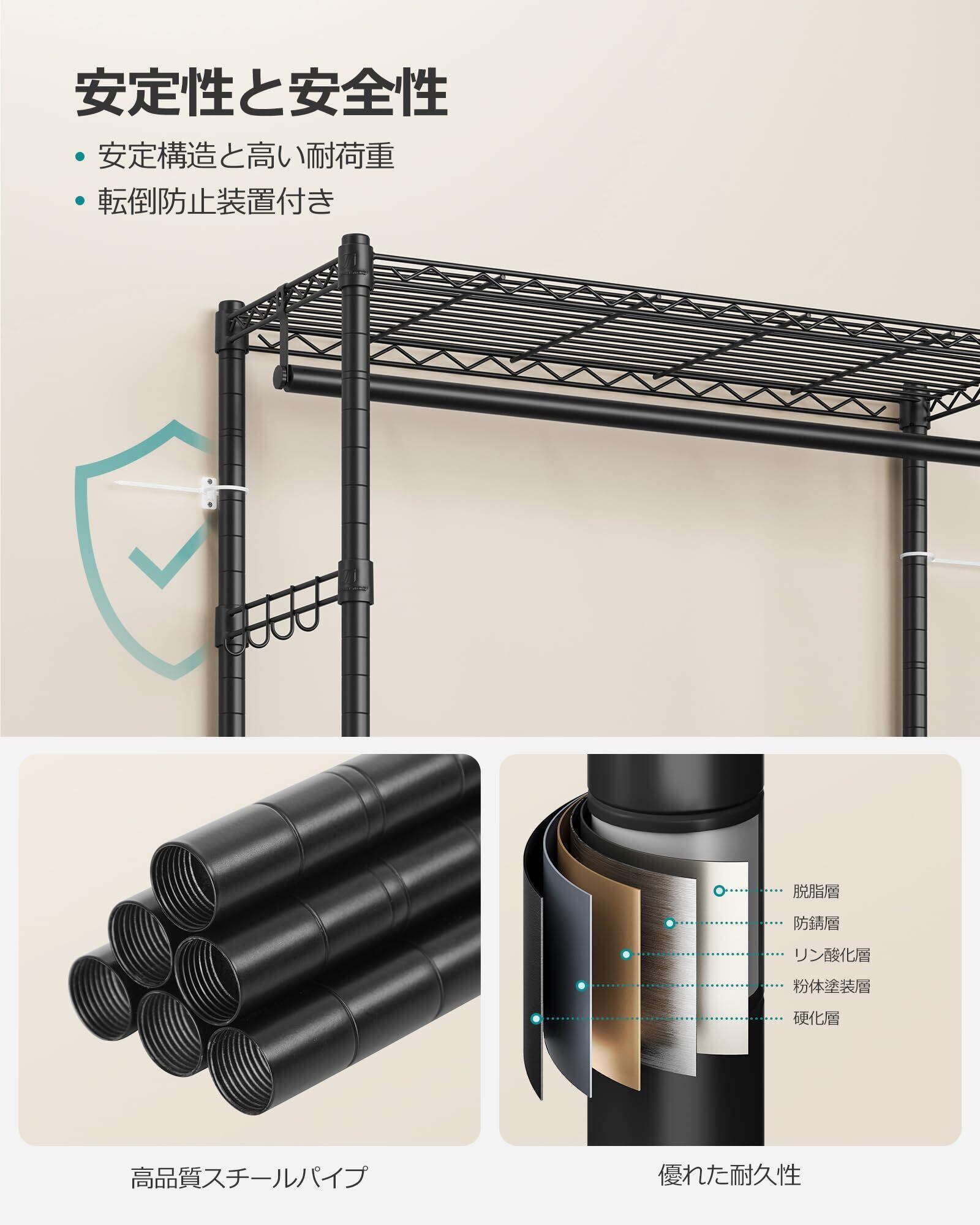 【頑丈で耐久性抜群】高品質の粉体塗装スチール製で防水・防錆、最大静的負荷能力137 kgのキャスター付き洋服スタンドは、重い衣類もしっかり支えます。長く使える耐久性を誇ります!