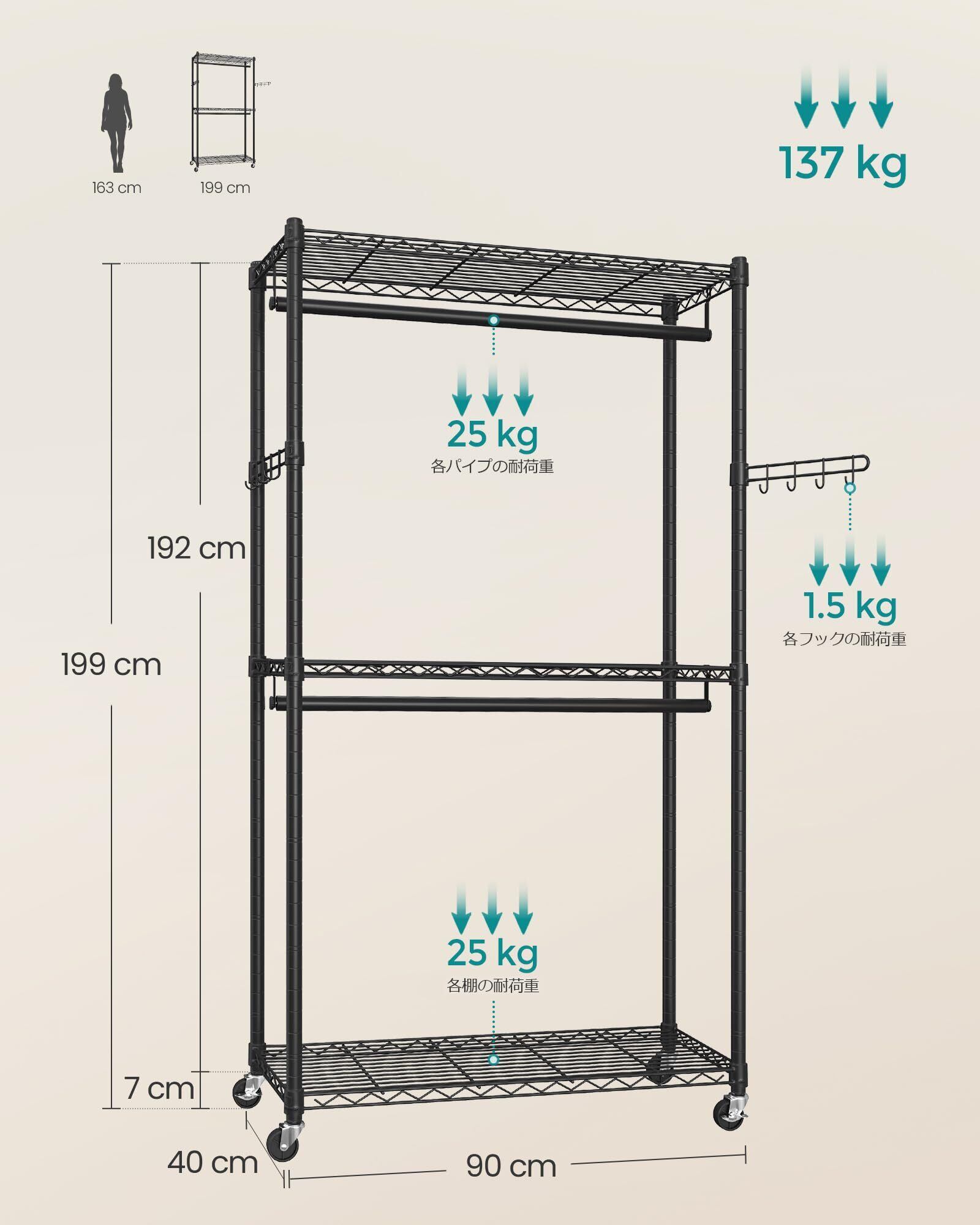 SONGMICS ハンガーラック 洋服かけスチールラック 2段式衣装収納 幅90cm 耐荷重137kg 調整可能な棚とポール 3つ棚有り フック、キャスター付き 簡単組立 ワードローブ 黒 LGR413B01