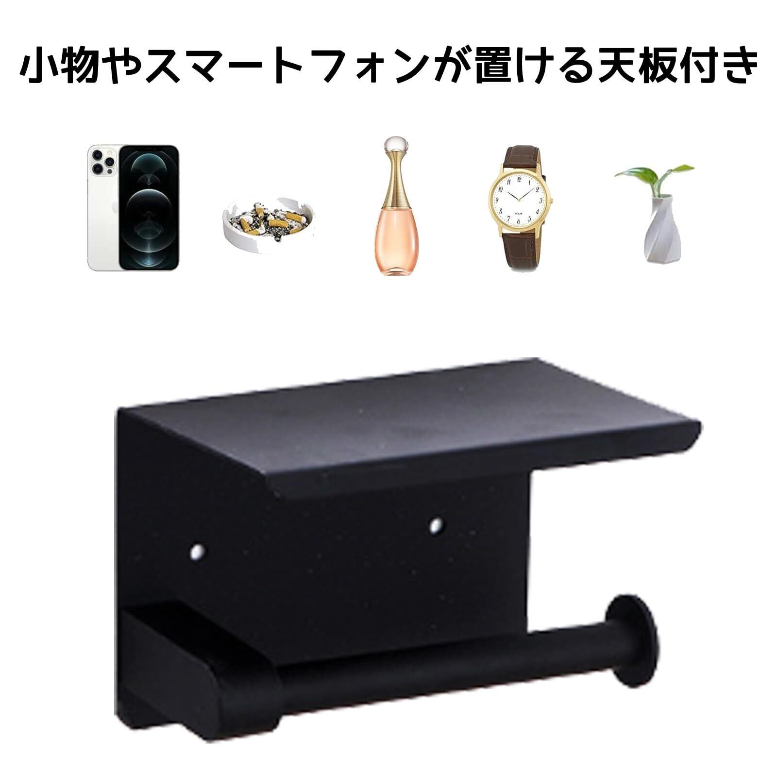 【小物置き棚付き】ペーパーホルダーは小物置き棚があり、スマホやお財布、生理用品などの小物を置くのに大変便利です。