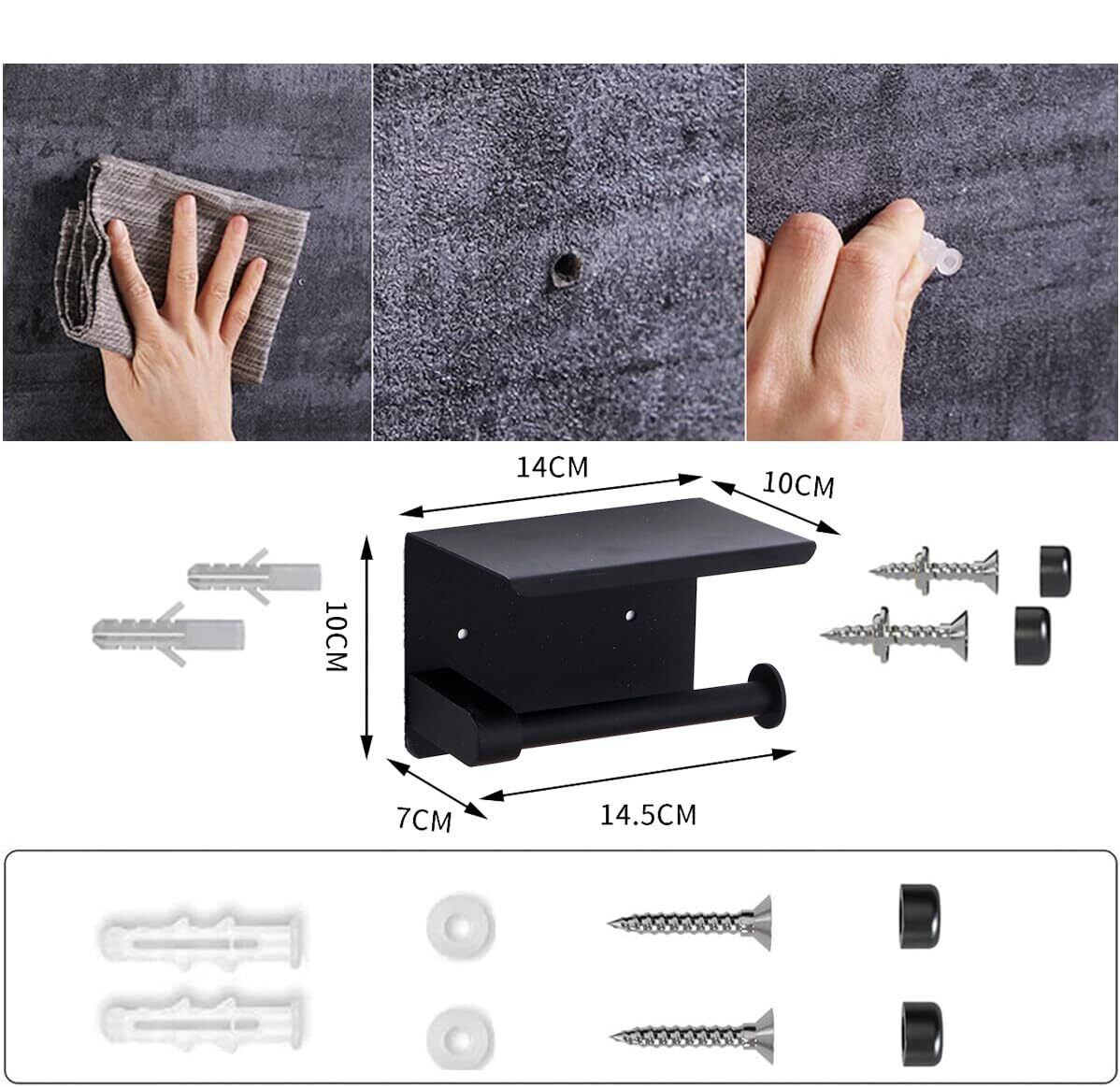 トイレットペーパーホルダー 棚付き 紙巻器 小物置き 壁取り付けネジ付き ステンレス製 バスルーム&キッチン用 (ブラック - トイレットペーパーホルダー)