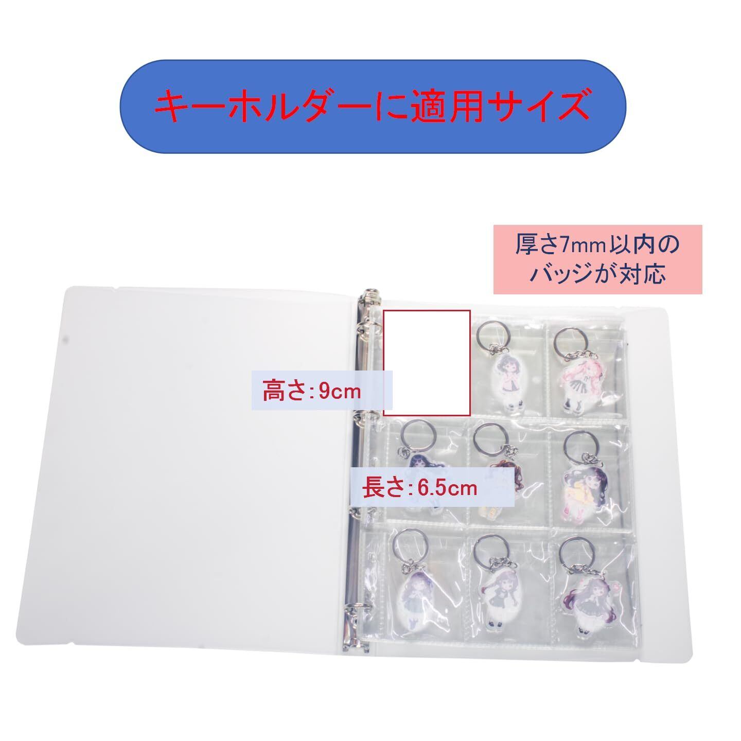 【最大72枚収納可能】缶バッジ収納ファイル*1枚、キーホルダー収納ファイル*8ページです。1ページにつき9ポケット、合計8ページで最大72枚収納可能です。缶バッジなどの形状に最適です。