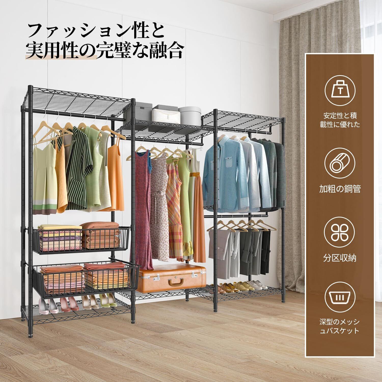 ハンガーラック 頑丈 ワードローブ 大容量 棚板高さ調節 洋服ラック 洋服掛け バスケット付き たっぷり収納 収納ラック 幅219x奥行40x高さ195cm