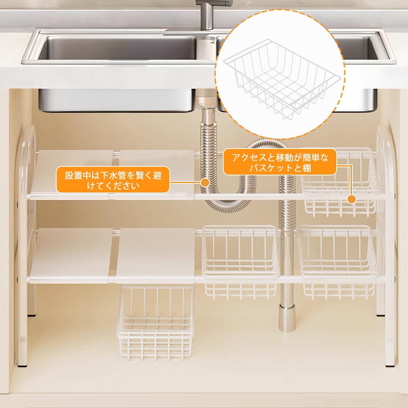 シンク下収納ラック, 洗面台下収納 洗面台下収納 伸縮式, 2段収納 キッチン収納ラック 組み立て簡単 省スペース 収納バスケット5個付き (ホワイト)