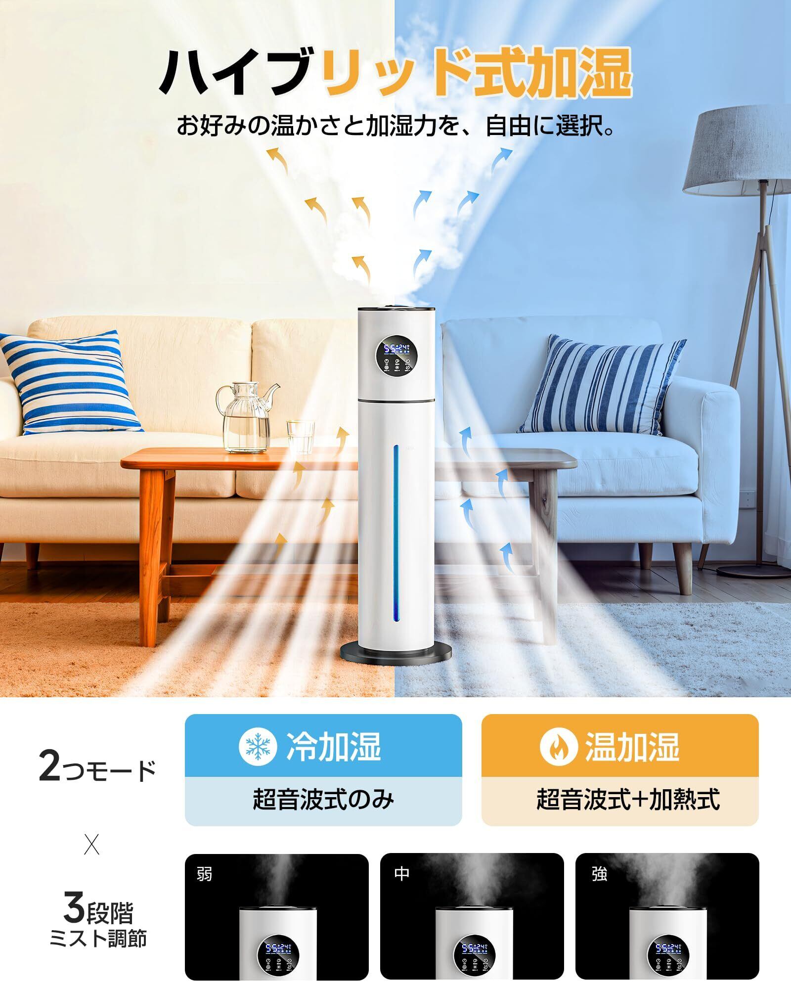 加湿器 ハイブリッド 9L大容量超音波×加熱式 空気清浄スチーム 上部給水 40畳 6段階加湿調整 60時間連続運転 省エネ 静音 360°回転吹出口 アロマ対応 タイマー付 空焚き防止 お手入れ簡単 花粉症・乾燥対策に最適 寝室/オフィス/家庭用