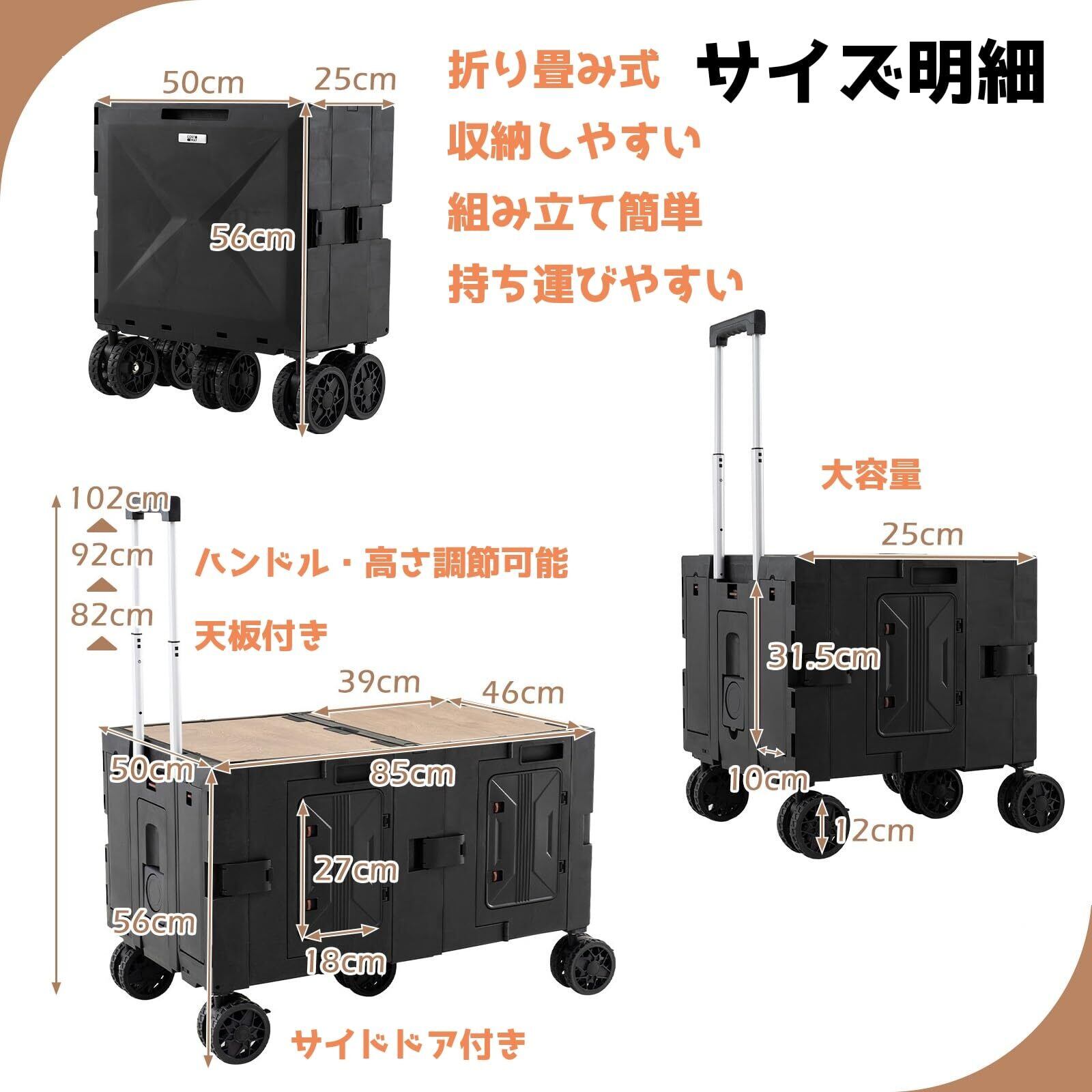 【サイズ】展開時:幅50x奥行85x高さ56cm(天板まで);折り畳み時:幅50x奥行25x高さ56cm;ハンドル高さ3段調節可能:82cm-92cm-102cm