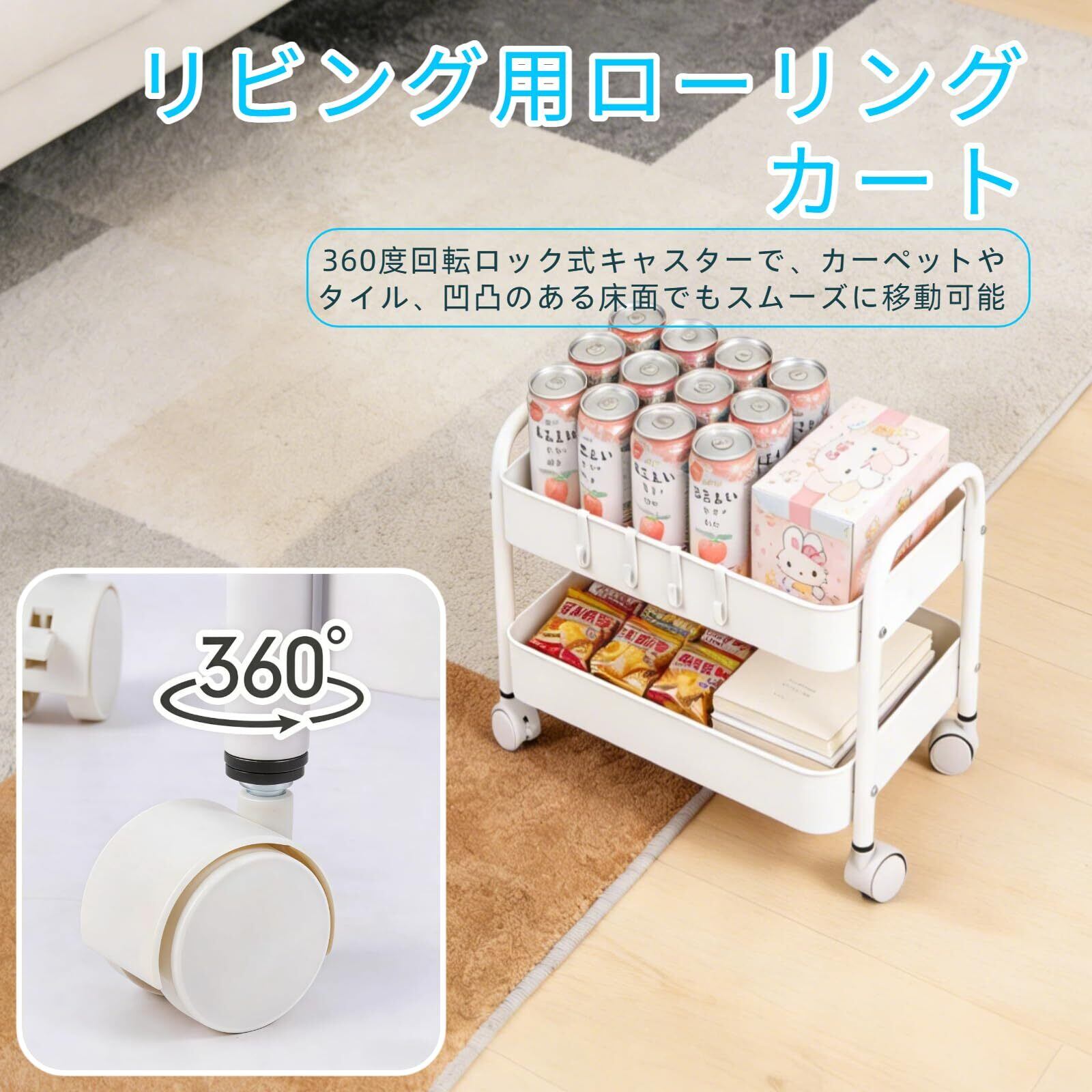 【Ufriandz多機能キッチントロリー】移動に便利な キャスター付きワゴン 2段 トロリー。片手で移動できるトロリー。360°回転するプロ仕様のキャスターが4個付いているので、重いものを載せても楽に移動できます