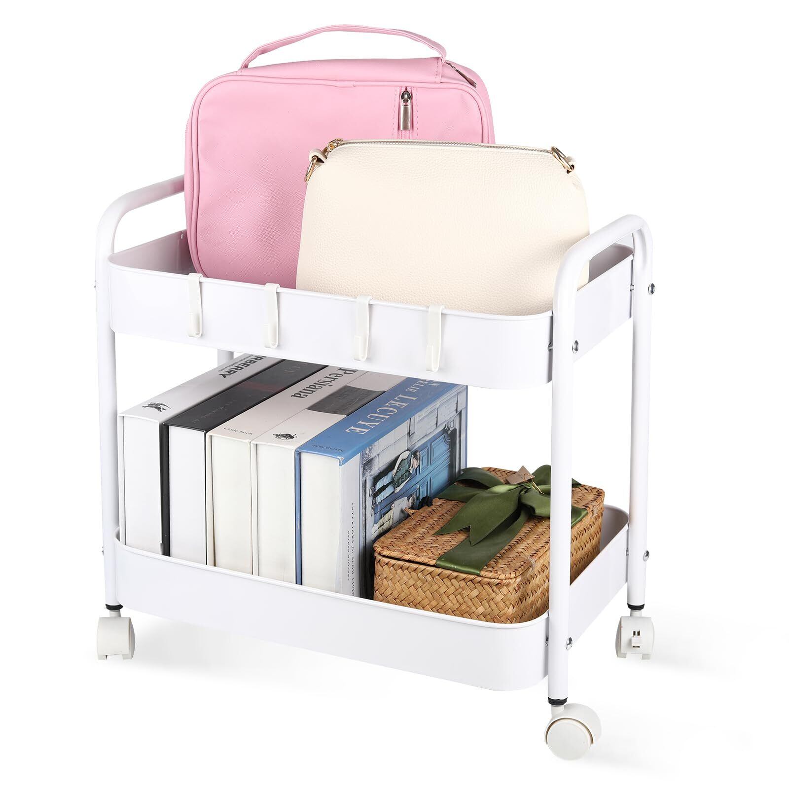 Ufriandzスチールラック 低い小物収納ワゴン 2段 デスク下収納 ストッパー付きキャスター付き 収納ラック全鋼 移動に便利 寝室 オフィス ランドリー 狭いスペース,白