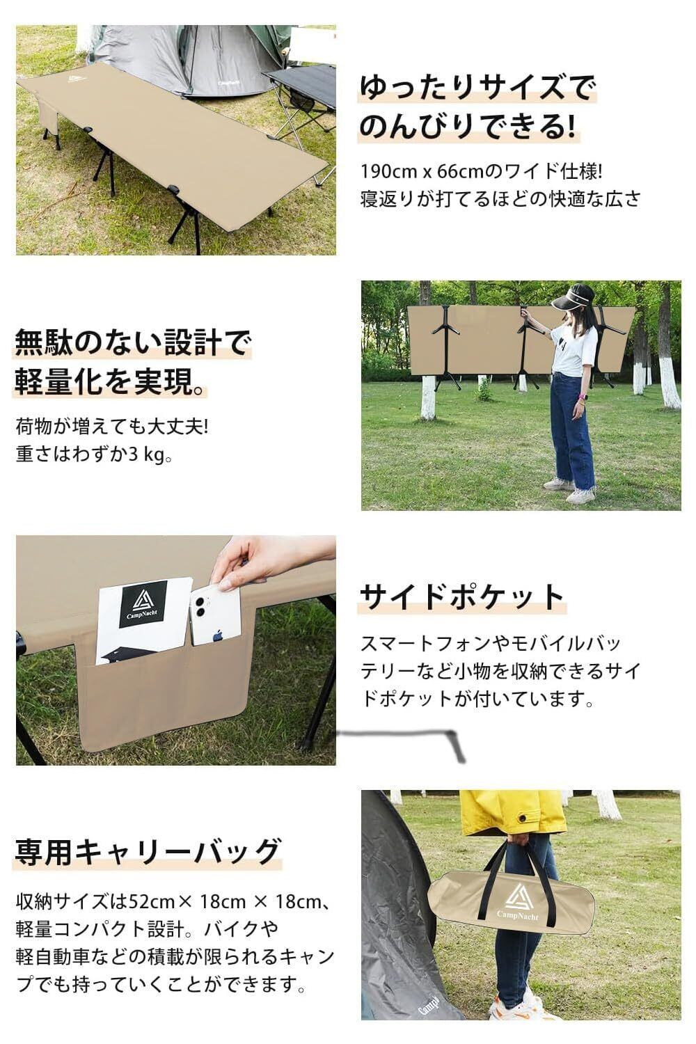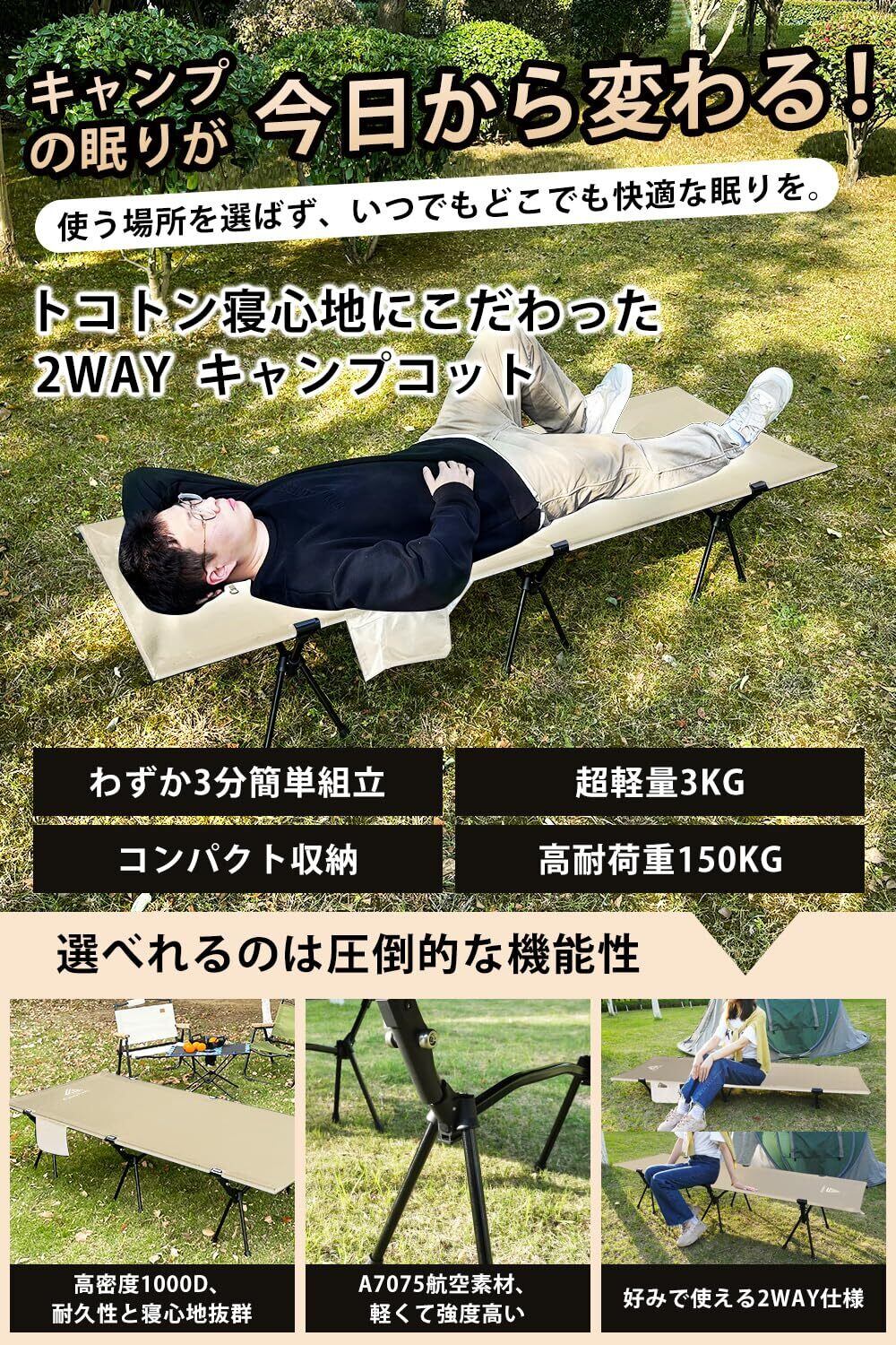 CampNacht 2WAY アジャスタブル コット軽量3kg 静音設計 折りたたみ式 ハイ/ロー切替可能 コット キャンプ アウトドア ベッド ワイド 組立簡易 コンパクト キャリーバッグ付き 耐荷重150kg 野外用 自宅用 会社用 アップグレード版 日本語説明書付(ベージュ)