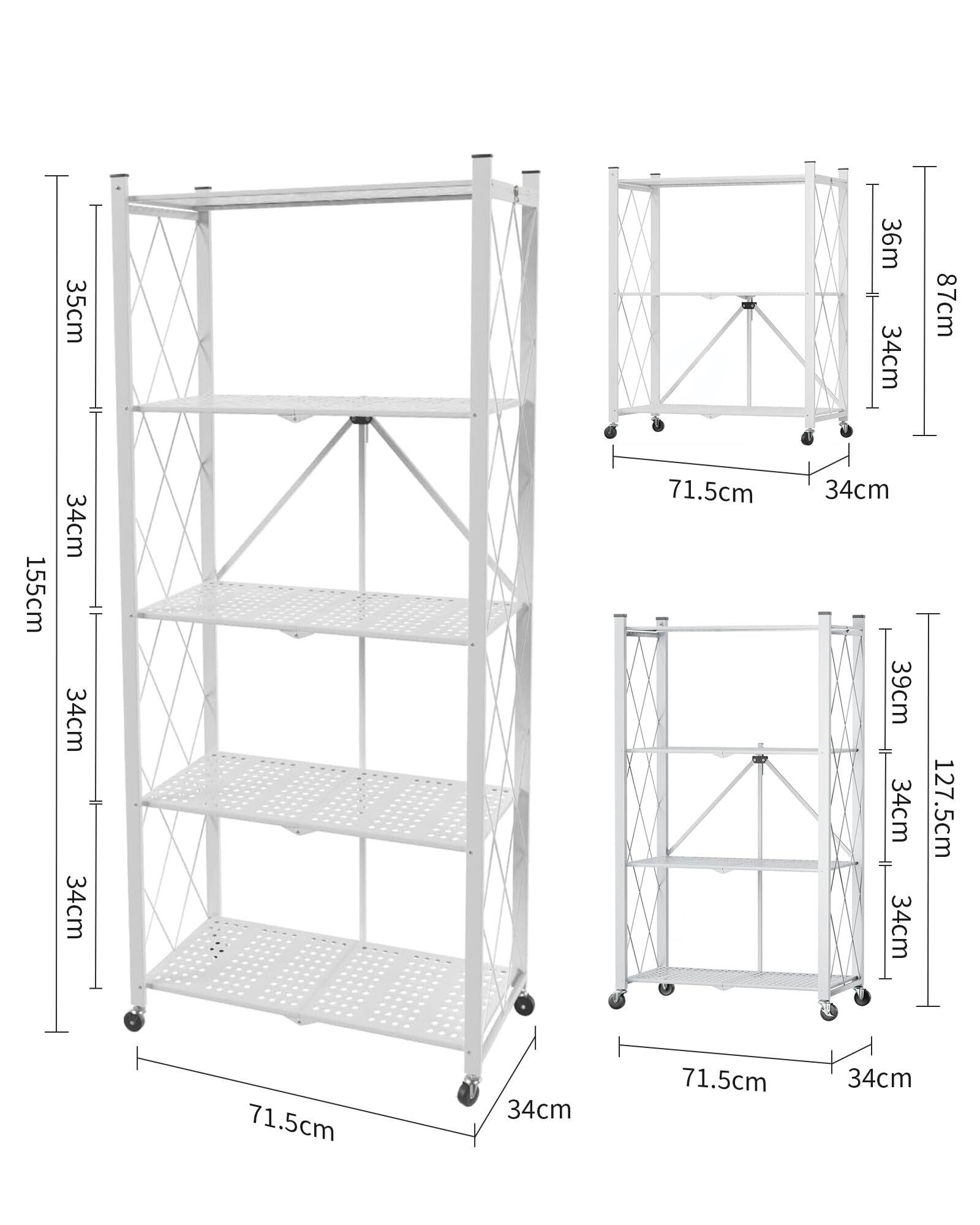 QIUYMI 折り畳みラック 棚ラック 4段 幅71×奥行34×高さ127cm 折りたたみ スチールラック メタルラック 収納ラック オープンラック 折りたたみ式 360°キャスター付き 防サビ 高耐久 省スペース 組立簡単 移動便利 家庭用収納 キッチン 寝室 (ホワイト, 4段)