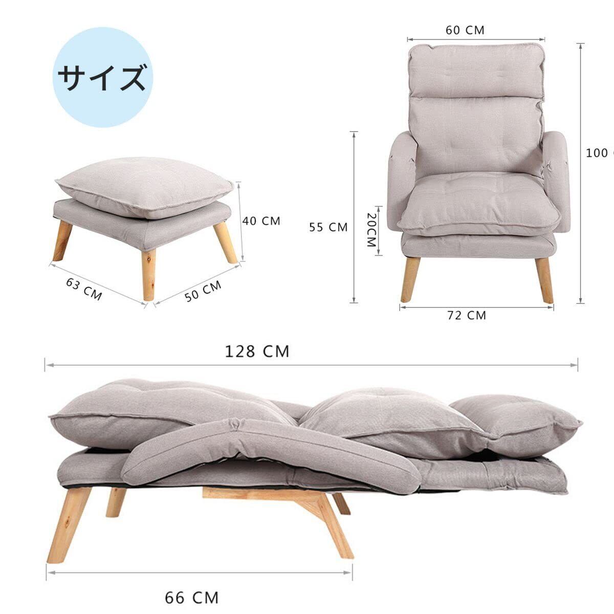 【製品仕様】本体サイズ:幅72cm×奥行66cm×高さ100cm オットマン:幅63cm×奥行50cm×高さ40cm。 材質:張り材:ポリエステル100% 中材:ウレタンフォーム 構造材:スチールパイプ 脚部:ラバーウッド
