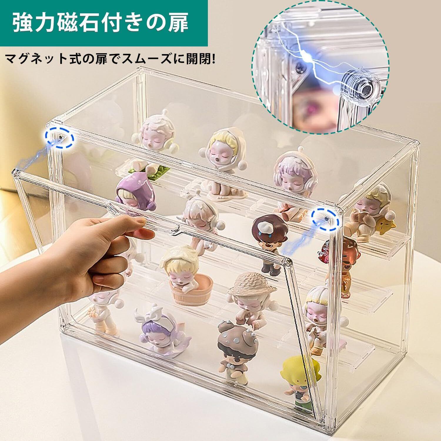 【便利な設計】このディスプレイケースは、自由にレイアウトできる可動式棚板、収納物に合わせてスペースを調整可能。90度開閉可能なマグネットドア、片手でもスムーズに収納物の出し入れができます。重ねてもずれない溝加工で、安定した積み重ねが可能。板を組み合わせるだけで、数分で完成するので、手軽に使える透明展示箱です。