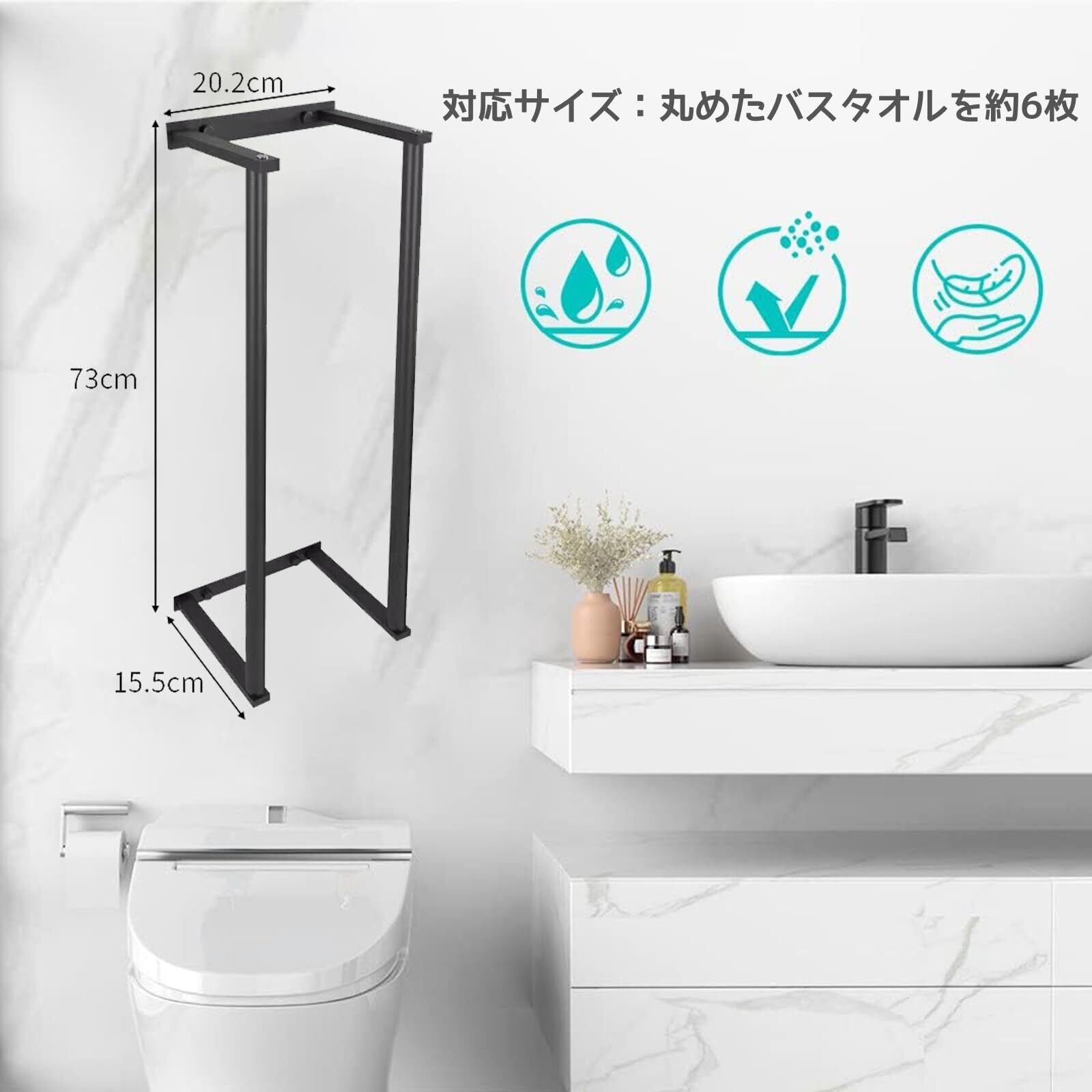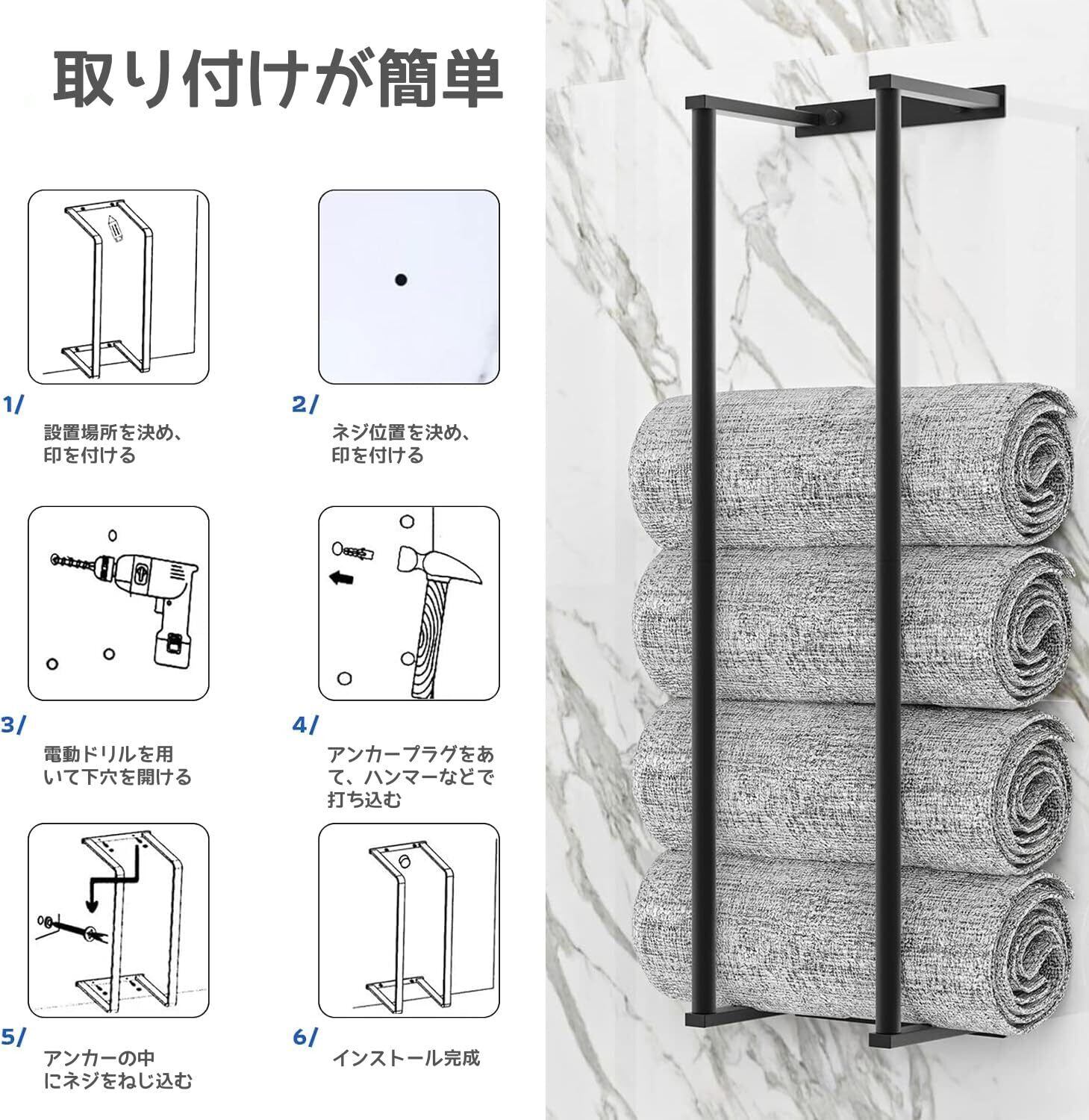 タオルラック 壁取り付け タオルハンガー タオル掛け バスルームタオル収納 バスタオルスタンド おしゃれ 丸めて収納ランドリーラック バスタオル置き タオル収納 タオルホルダー 取り付け簡単 省スペース コンパクト シンプル (ブラック)