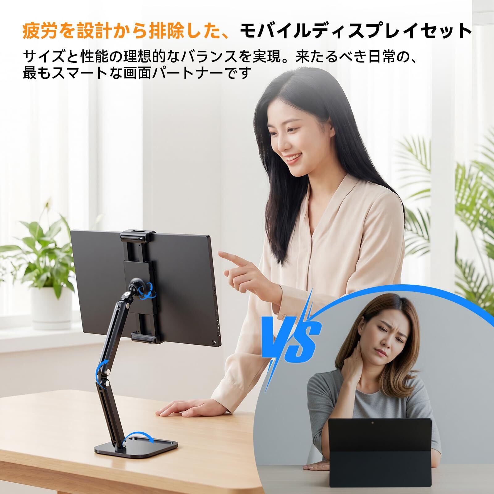 【疲れない姿勢設計】自由調節できる「卓上スタンド付き」で、疲れない姿勢をキープ。デスクワークやゲーム中、モニターの高さや角度が合わず、首や肩のコリに悩まされていませんか?このモバイルモニター 15.6インチに付属する卓上スタンドは、上下・首振り・傾斜を自由に調節可能。15.6インチポータブルモニター。お好みの視野角に簡単に固定でき、理想的な姿勢で長時間の作業やプレイを快適にサポートします。狭いデスクでもコンパクトに設置でき、視線を下げずに使えるので、姿勢改善と疲労軽減に貢献します。