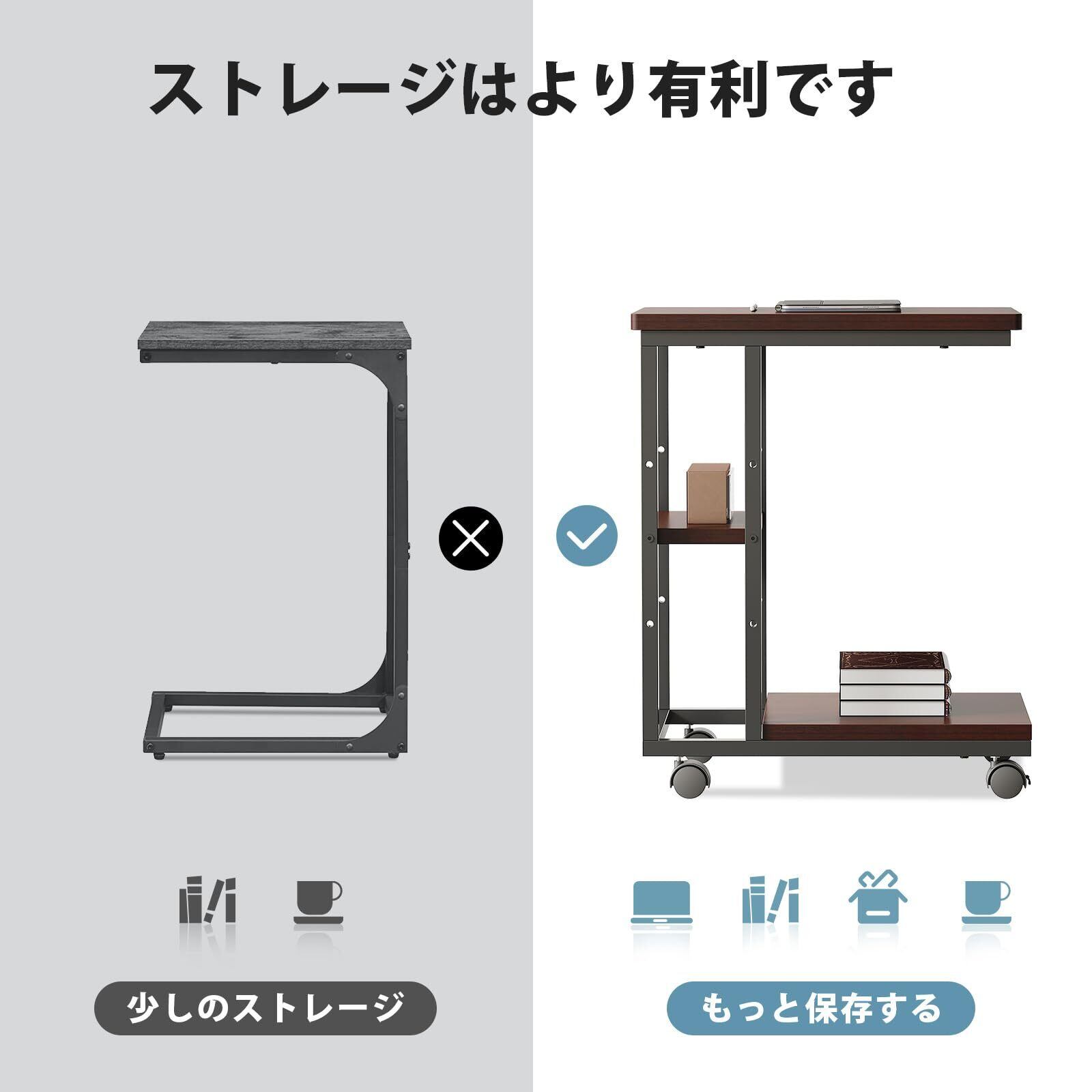 【コ字型テーブル】サイドテーブル キャスター付きはコ字型、ソファやベッドの下のスペースに入れ、隙間に差し込んでも使えます。ソファのサイドテーブルやリビングのサイドテーブルとしても使えます。