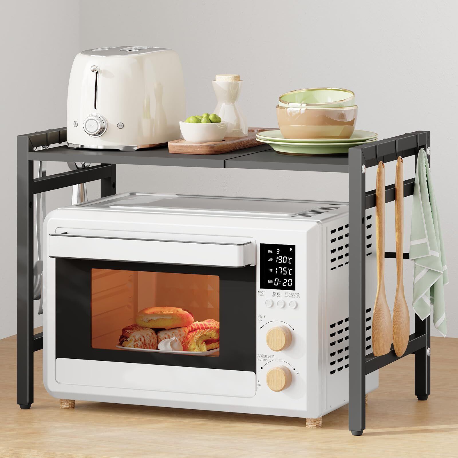 Somdot レンジ上ラック 伸縮式 トースターラック 幅39~60cm レンジ置き台 棚板高さ調節可 キッチンラック Sフック6個付 組み立て簡単 ブラック