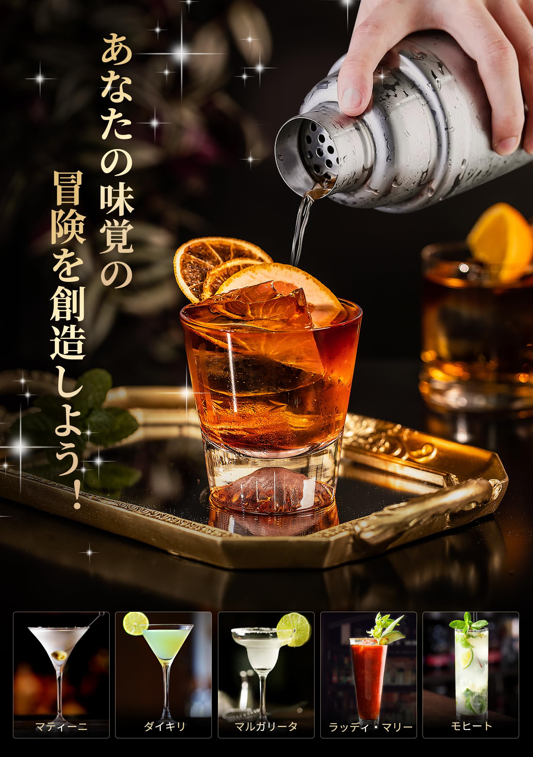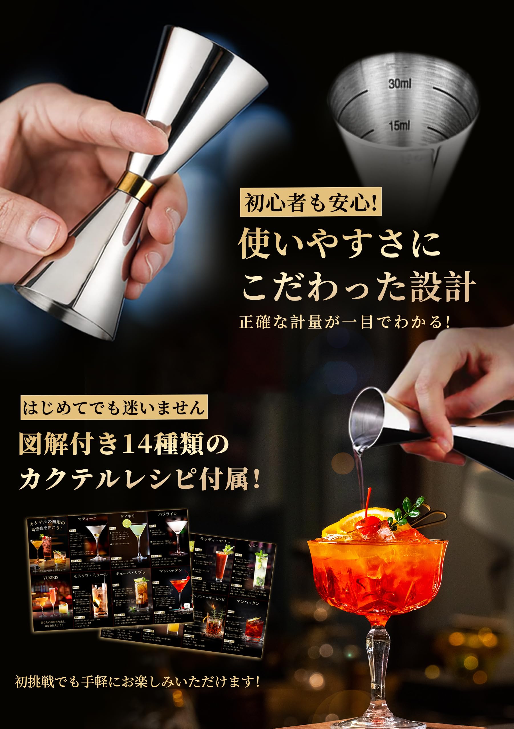 プレミアムステンレススチールカクテルセット:錆びにくい計量カップ、ミキサー、バースプーンはすべてプレミアムステンレス製。計量カップは無毒無臭の食品グレードの素材でできており、錆びにくく、表面は精密に研磨されています。オリジナルの色と光沢、滑らかで繊細、心地よい手触り。家庭用にも業務用にも適しています。手洗いまたは食器洗い機で簡単に洗えます。初心者の方でも安心してお使いいただけます。