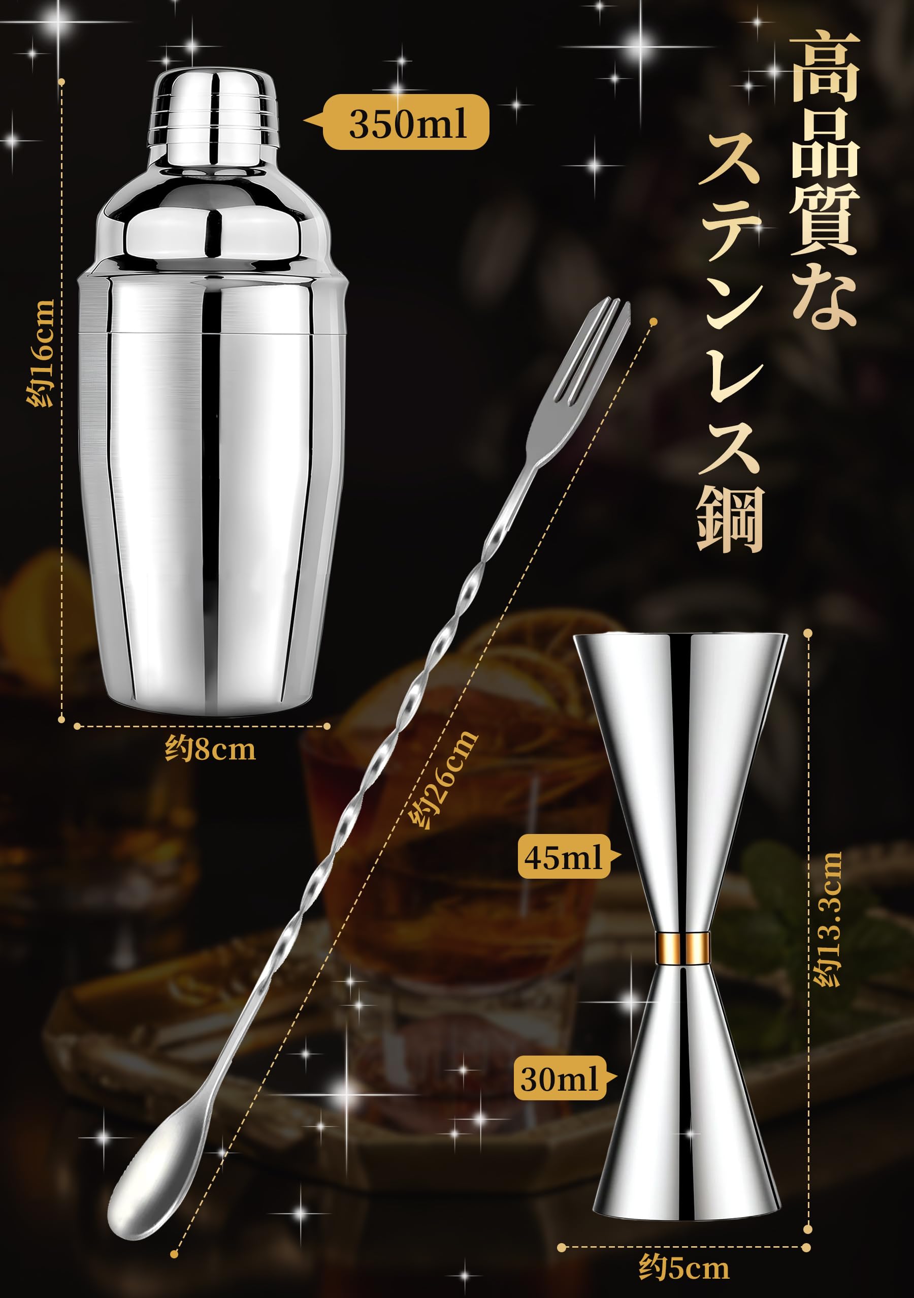 カクテルシェイカー セット 3点セットカクテルシェーカー 350mlメジャーカップ 30-45ML バースプーン 26cm カクテル完全ガイドがついています 初心者用 業務 自宅用