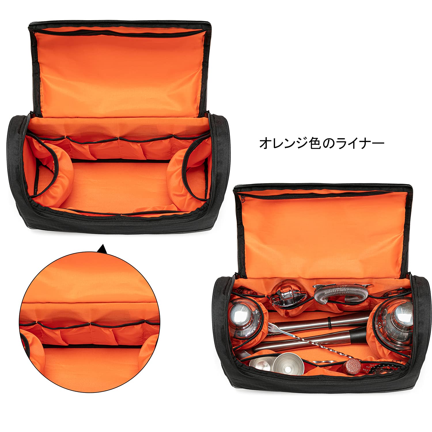 素材:外側が高級で耐久性のあるナイロン素材で作られています。内側にはクッション材が入っていて、カクテルセットをよく保護します。オレンジ色のライナーなので、中身が見やすくなっています。