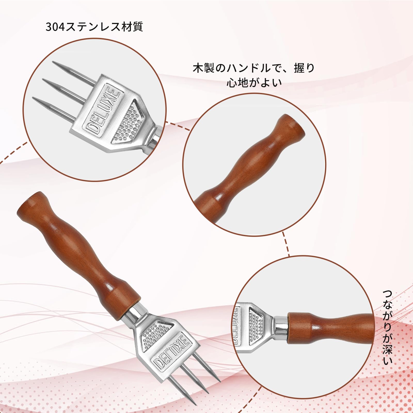 【3本爪のアイスピック】一般的なアイスピックに比べ、直線状に氷を割り取る時に便利です。丸氷を削り取る際も、3本のそれぞれの爪を活かして、より能率的に作れます。