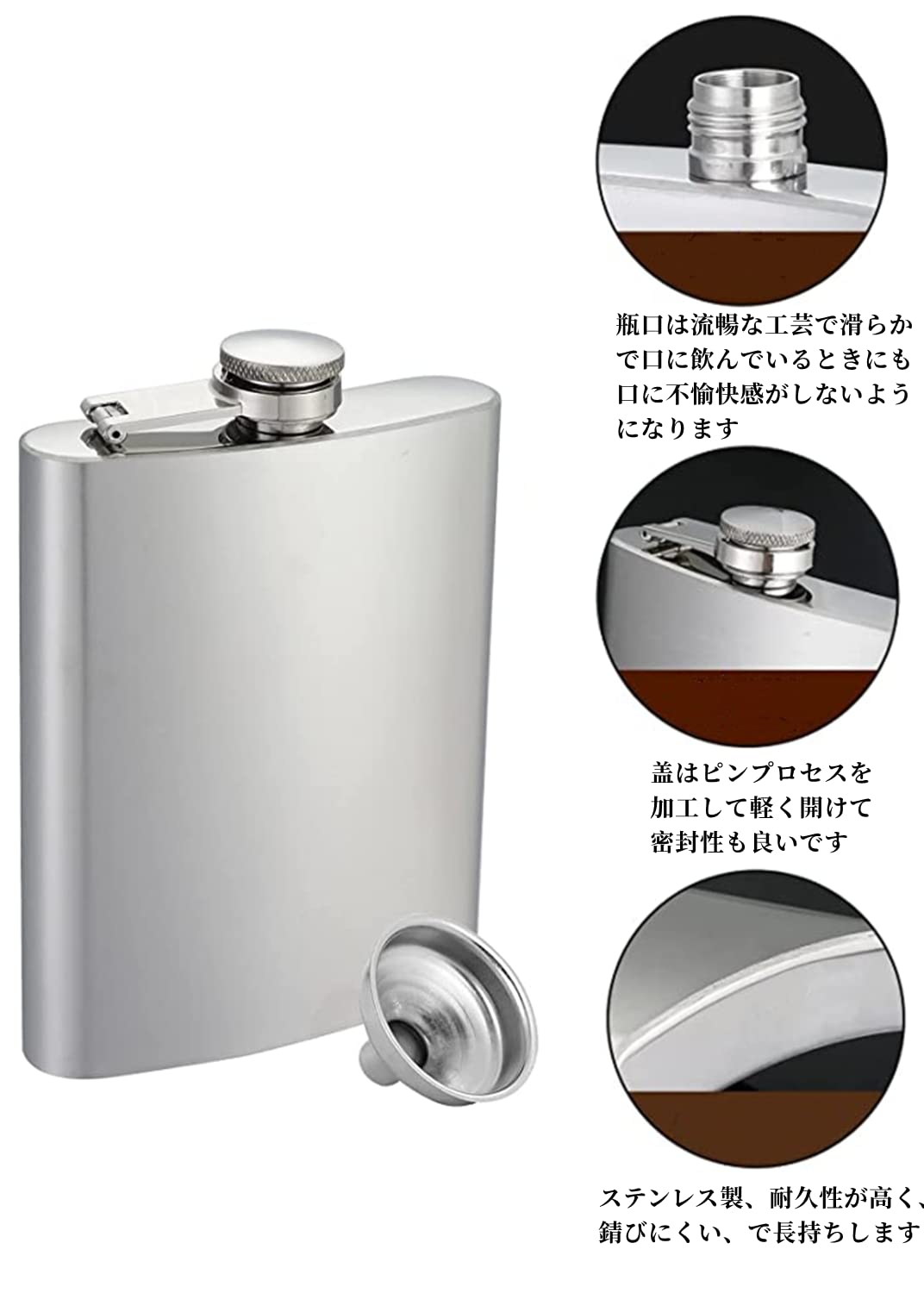 スキットル ヒップフラスコ ステンレス製 漏斗付き大容量 ウイスキー 清酒 軽量 持ち運び便利 (10オンス-シルバー)